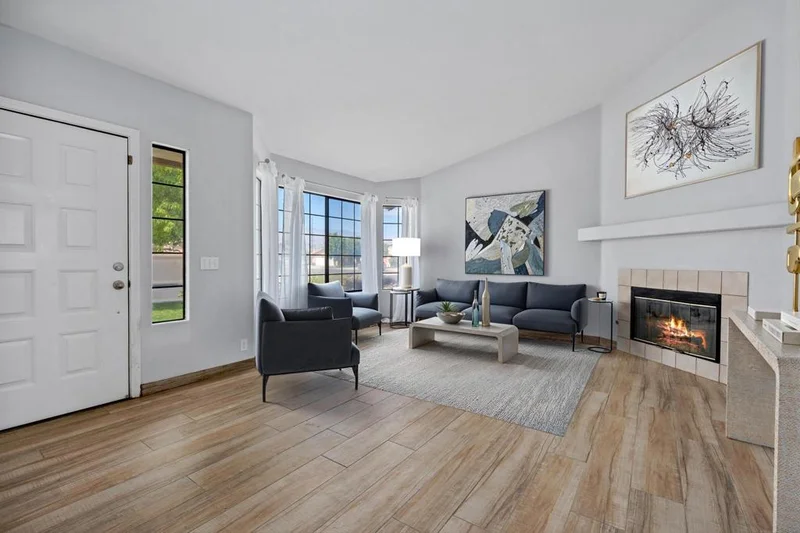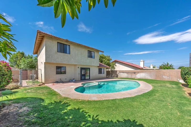 Wonderful pool home in Indio! Perfect as a primary residence or short-term rental! (STRs permitted by the City of Indio)This two-story residence offers a bright, open layout with wood-look tile flooring, a formal living room with fireplace, and a separate family room ideal for relaxing or movie nights. The kitchen features stainless steel appliances, a breakfast bar, and dining area that flows easily for everyday living or entertaining.Upstairs includes three bedrooms, highlighted by a spacious primary suite with dual sinks, walk-in closet, and shower/tub combination.Step out back and enjoy a large yard with a sparkling pool and spa... just waiting to be transformed into your private desert retreat!! Additional highlights include a 2-car garage, a great location near schools, shopping, and restaurants! PLUS no HOA!Interested in rental potential? Buyers may inquire with the City of Indio about obtaining a short-term rental permit!A great opportunity at a great price... don't miss this one!*All furnishings have been virtually staged.*