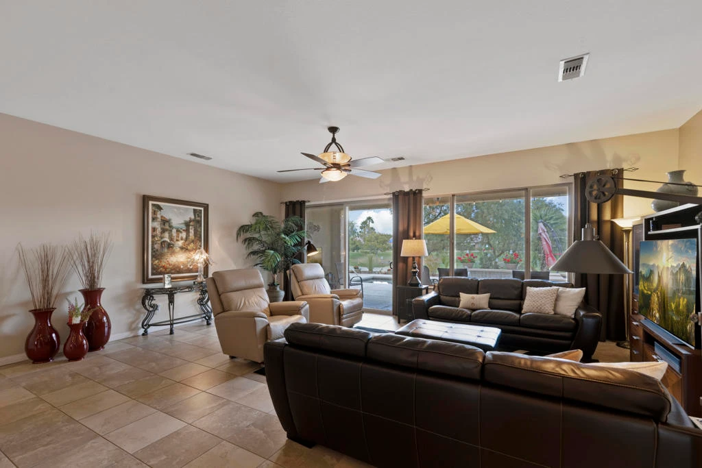 Welcome to the highly sought after Castellano model offering 2230 sqft of thoughtfully designed living space in meticulous condition. Perfectly positioned on the golf course with no golf ball exposure. This home delivers privacy, views and resort style comfort. The moment you enter through the elegant glass front door, you'll notice the quality and care throughout. Plantation shutters accent the windows and all ceramic tile flooring in the main living areas provides both sophistication and easy maintenance. The kitchen is built for entertaining and everyday living featuring: ** Wrap-around entertainment bar **Center Island **Walk in pantry ** Eating nook ** Pendent lights and Sola tube. A formal dining room offers space for hosting while the dedicated office/den provides flexibility for work or hobbies. The spacious primary suite is exactly what you would expect, generous proportions, comfort and functionality with the aded bonus of a split AC system for enhanced climate control. The second bedoom and full second bath are ideal for guests, complemented by a convenient powder room. Additional highlights include **Laundry room with cabinets and utility sink. ** 2 car garage plus golf cart garage and extra storage. ** Soft water system for entire home ** Newer HVAC system,** Newer Hot water heater,** Newer pool equipment.Step outside and enjoy beautifully landscaped front and rear yards with mature palms, a pool and spa, professional misting system, new cool coating on the patio and stunning golf course views. Walking distance to the Montecito Clubhouse. Offered turnkey furnished with a few exceptions, this home is truly move in ready. Simply bring your suitcase and start enjoying the lifestyle. This is golf course living done right!