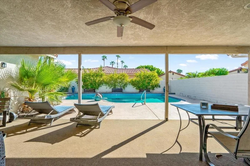 Welcome to your desert retreat in the gated golf community of Indian Palms, Indio. This 3-bedroom, 2-bathroom single-level home spans 2,111 sq. ft. and offers an inviting blend of comfort and functionality. Thoughtfully maintained, it features a brand-new water heater, pool heater, and a fully owned solar system--bringing efficiency and peace of mind.Inside, the open floor plan flows seamlessly from the kitchen and dining area into a step-down living room, highlighted by a white brick fireplace, wet bar, and expansive windows that bathe the space in natural light. The kitchen is well-equipped with stainless steel appliances, ample counter space, and a cozy breakfast bar with built-in storage. The primary suite includes direct patio access, a large mirrored closet, and an en-suite bathroom with dual sinks, a makeup station, jetted tub, and separate shower. Two additional bedrooms offer flexibility for guests, an office, or creative space.Step outside to a private backyard oasis designed for both relaxation and entertaining. A covered patio overlooks the sparkling pebble-tec pool, while mature landscaping creates a serene atmosphere. A grassy lawn tucked behind lush foliage adds extra space for pets or play.Located on a quiet street, this home offers access to community amenities including hiking trails, pools, and, of course, golf. With the Empire Polo Grounds just minutes away, plus nearby casinos, shopping, and dining, the lifestyle opportunities are unmatched. Whether you're seeking a primary residence, seasonal escape, or investment property, this home delivers on every level.ATTN Investors, FHA Assumable @ 4%
