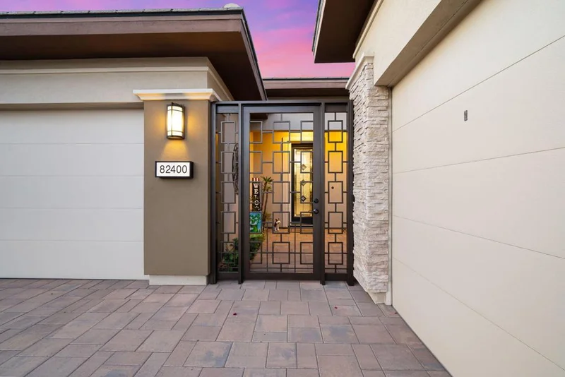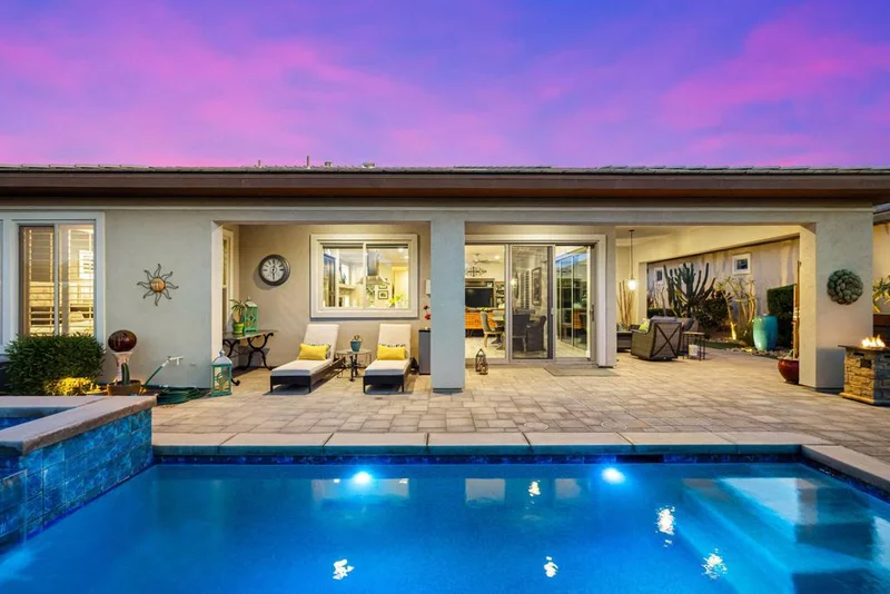 An exquisite Trilogy Polo Club sanctuary, this Immaginare single-family stunner blends luxury and livability with a resort-style, heated PebbleTec pool and spa, an elegant saltwater system, and a beautifully curated 2-bedroom, 2.5-bath layout with a sophisticated den/office featuring an accent wall of wood and a custom floor-to-ceiling lighted bookcase. A wrought-iron privacy gate ushers you into a dramatic foyer with a custom ceiling, leading to an expansive great room anchored by a stacked-stone fireplace and bespoke illuminated shelving, complemented by plantation shutters, automatic privacy shades, crown molding, and rolling glass walls that dissolve the boundary between indoors and the lush greenbelt beyond. The gourmet kitchen elevates every culinary moment with quartz countertops, espresso cabinetry with custom pulls, stainless appliances including a GE Monogram 42'' built-in refrigerator and GE Cafe package with beverage cooler, a striking tile backsplash, gas cooktop with custom hood, and an entertainer's island with bar seating. High-grade ceramic plank flooring, upgraded ceiling fans, paver driveway, and enhanced desert landscaping with fountains and artificial turf add refinement at every turn, while the primary retreat indulges with dual vanities, a soaking tub, floor-to-ceiling tiled shower, and a Closet World system. A true rarity, the 3-car garage features epoxy floors, storage racking, and split A/C in both bays, and the expanded paver patio with metal sunshade creates an outdoor haven perfect for unwinding beside the cascading spa. With an Eco water softening system and kitchen reverse osmosis completing the package, this home delivers an unparalleled blend of sophistication, comfort, and resort-style living. Membership transfer fee is $3000.00 at time of purchase by Buyer versus Standard membership fee of $20,000.00.