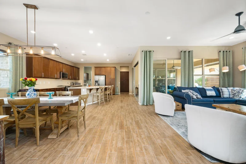 Located in the 'all ages' section of Trilogy Polo Club, this rarely available Solare model, with an exterior 'desert' elevation, features an open concept floorplan with a south-east facing greenbelt/park setting. Upgrades include a pre-paid solar lease to keep your electric bills to a minimum, a 15' rolling wall of glass that extends your living space onto the covered & pavered patio, tile flooring throughout most of the house, recessed lighting, upgraded shaker-style cabinetry and more! To maximize privacy for your guests, the guest suite is located on one side of the home, with the guest bathroom having a ceramic tile shower-over-tub combo. The den overlooks the front patio which is connected to the side yard. The kitchen boasts a large center island and has Jenn-Air stainless steel appliances. Perfect as a home office, the smart-space/laundry room features upper/lower cabinetry and built-in desk space with drawers. The primary bathroom has dual vanities and a large tile shower with glass/stone tile accent band. To keep your belonging cool during the warmer months, the garage features a mini-split a/c unit, along with epoxy flooring and built-in storage cabinets. Furnishings are available, ask agent. Meticulously upgraded and impeccably maintained, this exceptional home shows better than a model and reflects the seller's unwavering attention to quality and detail. Offering the ultimate in resort-style living. Call for a private showing today.