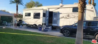 This property, on the west wall, is sold with a Montana 5th wheel that has been well maintained. The interior is deep woods and leather, with a great desk space, to keep your personal affairs in one place. There is an oversized shed, with a refrigerator and work bench, with double door entry, for easy use off of patio. The lot has a grass area adjacent to the patio space. The back wall, creates a semi private area, in the community. This all located in a 55+ community that has a 3 par golf course, chipping green, putting green, 9 hole mini golf, pickleball and tennis courts, bocce ball, an indoor shuffleboard courts, 2 clubhouses with pools and jacuzzies and an additional 4 satellites with pool, jacuzzies and mail boxes. This is all within a 24 hour gate guarded community of 801 lots, that consist of a combination of Park Models and RV lots, where you own the land. The resort has a limit of 270 day occupancy. It is a perfect place to spend your holidays in the sunshine.