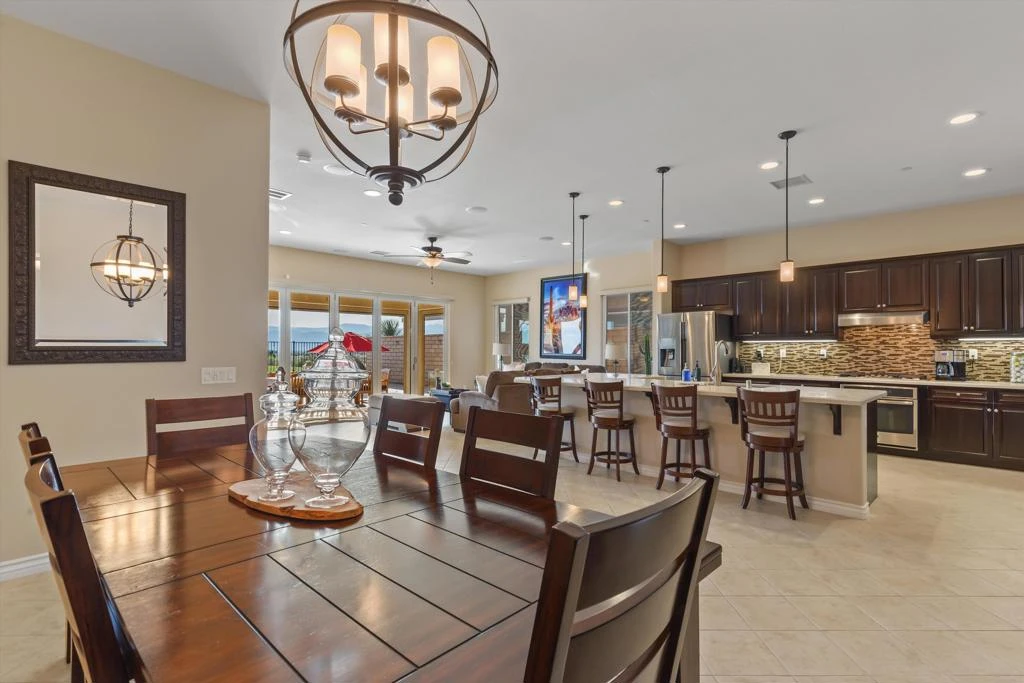 Welcome to resort style living at its finest in the prestigious guard gated community of Four Seasons Terra Lago. This beautifully appointed 3 bedroom, 2.5 bath home spanning 2,152 square feet offers an unparalleled combination of elegant interior spaces and breathtaking outdoor living, all set against sweeping golf course and mountain views.Step inside to discover a grand open-concept great room where the gourmet kitchen, dining, and living areas flow seamlessly together beneath soaring ceilings. The chef's kitchen features rich espresso cabinetry, a stunning mosaic tile backsplash, stainless steel appliances, and an oversized island with bar seating for five, perfect for entertaining. Walls of sliding glass doors bathe the interior in natural light while framing postcard worthy views of the fairways and San Bernardino Mountains beyond.Outside, your own private oasis awaits. The expansive covered patio, complete with a ceiling fan, mounted TV, and outdoor kitchen with dining for eight, overlooks a sparkling lap pool and spa with cascading waterfall. As the sun dips below the mountains, the pool lights illuminate and the desert sky transforms into a canvas of color, making every evening feel like a special occasion.Residents of Four Seasons Terra Lago enjoy world class 55+ community amenities including a clubhouse, fitness center, tennis and pickleball courts, and an active social calendar, all just minutes from the shopping, dining, and entertainment of the greater Palm Desert area.This is more than a home. It's a lifestyle.