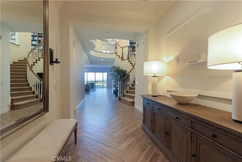 Discover an extraordinary opportunity to own a rare 11,000 sqft estate nestled within the exclusive, guard-gated community of Hidden Canyon, renowned for its stunning city and mountain vistas. This luxurious property boasts a lush backyard featuring a full suite of amenities, including a BBQ island, swimming pool including four 25-yard lap lanes, hot tub, water fountain, paved patio, and a shaded California Room with a fireplace, perfect for entertaining. The back of the home offers breathtaking panoramic views of the Irvine Spectrum, OC Great Park, and Trabuco Canyon mountains from the elevated 180-degree vantage point. Located at the end of a quiet street, 105 Iron Gate is a beautiful Capri Collection Plan 5 residence that welcomes you with an elegant tiled entry, a dramatic spiral staircase, and a grand foyer with soaring ceilings and a dazzling chandelier. The spacious family room, illuminated by retractable sliding doors, features a cozy fireplace and designer lighting with remote-controlled drapery. The chef’s kitchen showcases double islands with granite counters, premium appliances including a 6-burner WOLF range, double ovens, microwave, and a double-door built-in refrigerator, plus a discreet prep kitchen and walk-in pantry. A private in-law suite with its own bath and entrance offers additional comfort on the main level. Upstairs, you'll find a versatile loft, three en-suite guest bedrooms, and a luxurious primary suite with a private balcony, sweeping views, a large walk-in closet, dual vanities, a spa-inspired tub, and a spacious walk-in shower. Dual laundry rooms, a community resort-style pool, cabanas, clubhouse, parks, trails, all within top-rated schools and just minutes from shopping, airports, freeways, and the stunning Laguna beaches.