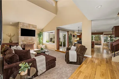 Beautifully updated 4-bedroom, 3-bath home with DOWNSTAIRS BEDROOM & FULL BATH in the highly desirable Woodbridge community of Irvine. The home was thoughtfully EXPANDED by nearly 300 square feet. Step through the stylish modern wood entry door into a dramatic living room with soaring ceilings, abundant natural light, and a striking stacked-stone fireplace that creates a warm focal point. Large windows & sliding doors enhance the open feel and bring in plenty of natural light throughout the main living areas. The REMODELED KITCHEN is designed for both everyday living and entertaining and features rich wood cabinetry, granite countertops, stainless steel appliances, and a large center island with bar seating. The kitchen overlooks the backyard and opens to the dining area and adjacent living spaces. An atrium offers a tranquil outdoor space and brings additional light into the home. Hardwood flooring extends through much of the downstairs, while carpeting adds comfort in the living room and upstairs bedrooms. Tile flooring can be found in the bathrooms. The downstairs bedroom, currently configured as an office, is located next to a full bathroom and can easily function as a guest room, home office, or multigenerational living space. Upstairs, an open walkway connects the spacious primary suite at the rear of the home to two secondary bedrooms and a full bathroom at the front. The primary suite offers generous space, a huge walk-in closet, and a beautifully upgraded bathroom with dual vanities, stone countertops, modern fixtures, and a large walk-in shower with designer tile finishes. The PRIVATE LOW-MAINTENANCE BACKYARD with attractive interlocking pavers is designed for outdoor enjoyment and entertaining with a covered patio, ceiling fan, and multiple seating areas surrounded by mature landscaping and privacy hedges. It is an inviting setting for relaxing with a good book, enjoying a morning coffee, or hosting family and friends. Additional highlights include OWNED SOLAR PANELS, upgraded bathrooms, recessed lighting, ceiling fans, an attractive paver driveway with matching walkway, and an attached 2-car garage with driveway parking. Woodbridge residents enjoy access to two lakes, pools, parks, tennis courts, pickleball courts, walking trails, and year-round community amenities. Served by the award-winning Irvine Unified School District (Eastshore Elementary, Lakeside Middle and Woodbridge High) with a LOW TAX RATE and NO MELLO-ROOS.