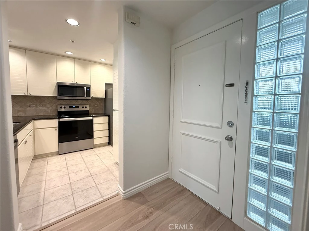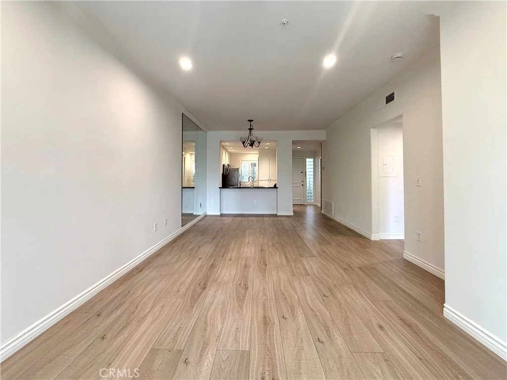 Experience the true Irvine lifestyle at the prestigious, guard-gated Metropolitan, where this immaculate first-floor condominium offers a sophisticated blend of comfort and style. Bathed in natural light and enhanced by elegant crown molding, wood flooring, and recessed lighting, the open-concept living space feels grand and expansive, anchored by a large floor-to-ceiling mirror and a light, bright kitchen featuring sleek stainless steel appliances, travertine backsplash, a convenient breakfast bar, and plenty of cabinet storage space. The primary suite serves as a true sanctuary, boasting a spacious walk-in closet with shelving and direct access to a private covered patio overlooking the lush grounds. A versatile bonus room with a large wardrobe offers the perfect footprint for a second bedroom or home office, while the spa-like bathroom is complete with a dual-sink vanity, deep soaking tub, and separate walk-in shower. Including one assigned parking space in the underground garage and resort-style amenities, such as a tropical pool, spa, clubhouse, and onsite fitness center, this home offers a tranquil retreat just minutes from JWA, fine dining, and major freeways.