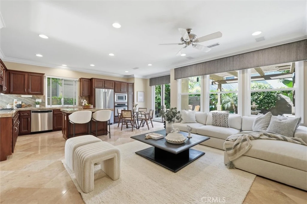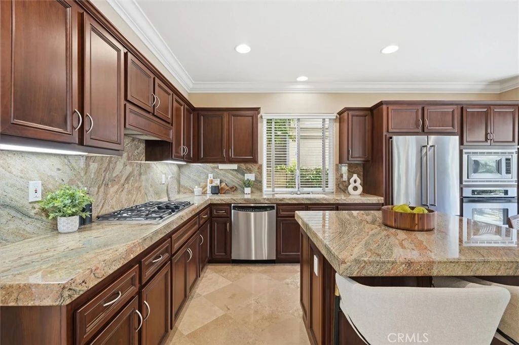 Tucked inside the prestigious 24-hour guard-gated community of Northpark in Irvine, 6 Versailles is a beautifully maintained, move-in-ready home proudly offered by its original owner. The thoughtfully designed floor plan features three bedrooms upstairs and a versatile main-level bedroom, currently configured as an office with custom mahogany built-ins and an adjacent full bath. Step inside to a light-filled interior showcasing polished travertine stone floors throughout the main living areas. The gourmet kitchen impresses with granite countertops, a center island, rich espresso cabinetry, stainless steel appliances, and a breakfast nook with backyard access. The kitchen flows seamlessly into a spacious family room with built-ins, a warm fireplace, and designer finishes perfect for both entertaining and everyday living. Living in Northpark means access to resort-style amenities including pools, BBQ areas, lush greenbelts, parks, playgrounds, tennis and basketball courts, and a clubhouse. Zoned for some of the area's most acclaimed schools including Hicks Canyon Elementary, Orchard Hills Middle, and Beckman High, and just minutes from Northpark and Orchard Hills shopping and dining, Tustin Ranch Golf Course, Citrus Ranch Park, The District, and major freeways and toll roads. Don't miss the opportunity to call 6 Versailles home, where luxury finishes, comfort, and community come together.