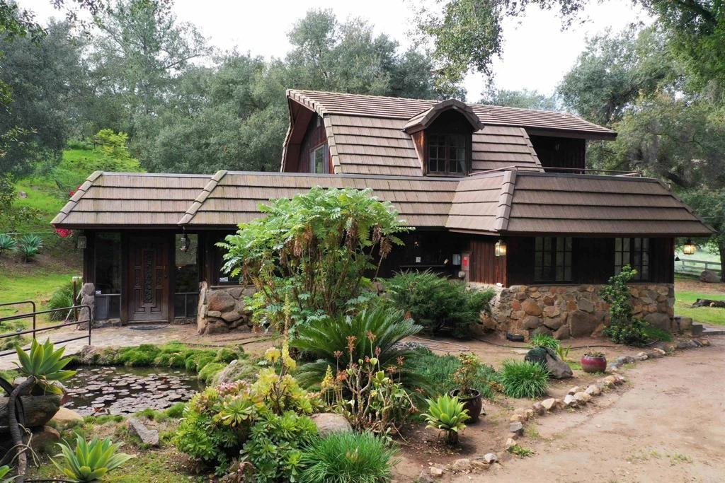 Located in Lawson Valley just 15 minutes from the conveniences of Rancho San Diego, this lodge-style retreat sits on two parcels totaling 14.13 acres, offering exceptional privacy, natural beauty, and wide-open space. A tranquil koi pond with a waterfall and charming stone bridge creates a memorable arrival at the front entrance. The home showcases timeless rustic character with natural stone accents, exposed wood beams, and expansive windows that fill the interior with natural light while framing peaceful views of the surrounding landscape. Inside, the spacious living room features pitched vaulted ceilings and a striking stone fireplace with a hand-carved wood mantle, creating a warm and inviting gathering space. The kitchen opens to the dining area and includes a large walk-in pantry for generous storage. Saltillo tile floors run throughout the main living areas, adding warmth and timeless character to the home’s design. The main level offers two bedrooms, including one with a half bath, along with a full guest bathroom featuring an accessible shower. A laundry room is conveniently located on the first floor, and French doors lead to the backyard, blending indoor and outdoor living. Upstairs, the expansive primary suite serves as a private retreat with wood beam accents, a cozy wood-burning stove, an upgraded bathroom, and an enormous walk-in closet. Step outside onto the oversized balcony to take in peaceful views and fresh air. Additional features include owned solar for energy efficiency and a detached dome garage/workshop with an office, providing flexible space for projects, equipment storage, creative work, or a private workspace. The property’s grounds create a truly tranquil setting, complemented by a mature succulent garden and mature oak trees that provide shade and natural beauty throughout the property. With animal enclosures already in place, ample open space, and a national park-like environment, this property offers exceptional privacy and room to create your dream rural lifestyle.
