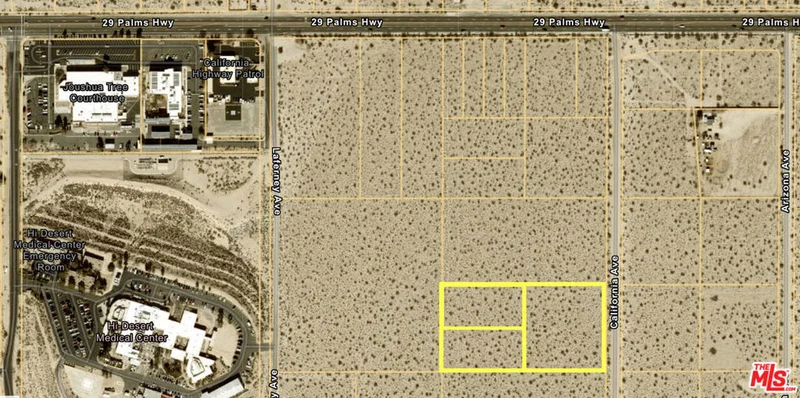 LOT SIZE SHOWN IS 3 LOTS COMBINED! Totaling approximately 4.78 acres. APN: 0604-121-35-0000 (1.25 ac), 0604-121-31-0000 (2.28 ac) and 0604-121-36-0000 (1.25 ac). Zoning JT/RL. Great opportunity to build right by Twentynine Palms Hwy on California Ave in the heart of Joshua Tree! Flat lot with desert & mountain views, utilities nearby and across the street from Joshua Tree Courthouse and Hi Desert Medical Center. No reports or survey. Buyer to verify all information and rely on their own investigations. Sold AS IS. 3 lots sold as one. Drive by and MAKE OFFER.