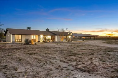 Fully remodeled 3BD/2BA + bonus room on 5 private acres with expansive desert and mountain views. Flexible for personal use, second home, or short-term rental. Renovated in 2022 with new roof, updated electrical, luxury vinyl plank flooring, fresh interior/exterior paint, upgraded appliances, new water heater, pool heater, and wireless pool controls. Open-concept living, dining, and kitchen. Spacious primary suite with dual vanities and private patio access. Outdoor features include heated pool, spa, fire pit, bocce ball court, and covered patio—ideal for enjoying Joshua Tree’s natural setting. Versatile Quonset structure perfect for studio, wellness, or creative use. Attached garage with EV charger. Offered fully furnished ($50K+ in furnishings included). Move-in ready. Previously operated as a short-term rental, with the current owner utilizing the property to help offset W-2 income through short-term rental use (buyer to verify with CPA).