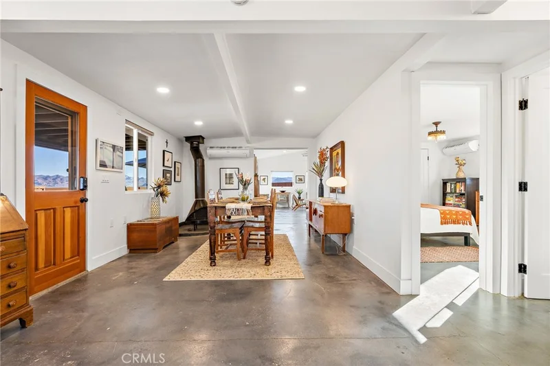 Exceptional Joshua Tree property offering 2.5 total acres comprised of two separate legal 1.25-acre parcels, sold together. Located just off a paved road and only minutes from Joshua Tree National Park, this property combines privacy, convenience, and long-term flexibility. The 2-bedroom, 1-bath home features an open-concept layout with seamless flow between the living, dining, and kitchen areas. Polished concrete floors run throughout, creating a clean, modern desert aesthetic. The dining space is anchored by a statement Malm fireplace, adding warmth and architectural character. The kitchen includes a Bertazzoni induction range, blending high-end performance with modern design. Mini-split systems throughout the home provide efficient heating and cooling year-round and stacked washer and dryer. The shaded front porch offers comfortable outdoor living during the summer months. In the rear, an oversized deck with a large hot tub captures expansive 360-degree desert and National Park views. The privacy of the acreage combined with Joshua Tree’s dark skies makes this an ideal setting for stargazing, entertaining, and quiet desert living. One of the parcels is fully fenced and accessed through a solar-powered electric gate. Mature desert landscaping, including established Joshua Trees, enhances the setting while preserving open desert surroundings. The property is connected to city water, adding everyday convenience and long-term value. A separate detached garage provides additional storage and presents potential for conversion into an ADU or guest house (buyer to verify with county). With two legal parcels included, the possibilities are significant expand, build an additional structure, create a multi-structure compound, or hold the second lot for future investment. Well-suited as a primary residence, vacation home, or short-term rental opportunity. A rare opportunity to own acreage, privacy, views, and flexibility in a prime Joshua Tree location.