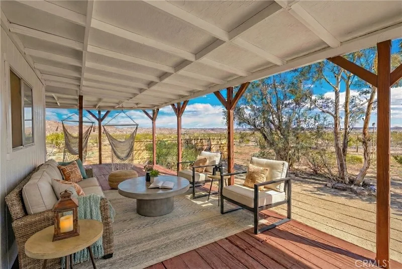 The Ultimate Multi-Generational Joshua Tree Retreat!* Rarely do you find a property that perfectly balances social connection with total privacy. Situated on a sprawling 2-acre lot in North Joshua Tree, this unique estate features two distinct designer homes, offering the ideal setup for a young family with frequent long-term guests, an adult child who visits for the weekend, or a permanent home-office-away-from-home. *The Main Residence: Open, Airy, and Social* The heart of the property is a character-filled 2-bedroom, 1-bathroom home designed for gathering. Step through the front door into an expansive living space defined by high ceilings, natural light, and a seamless flow. The large kitchen was built for entertaining, ensuring the "cook" is always part of the conversation. The home is rounded out by a freshly updated modern bathroom and two serene bedrooms, each equipped with individual mini-split systems for personalized climate control. A dedicated bonus room serves as the ultimate flex space—perfect for a home office, a high-end home gym, or a quiet art studio. *The Guest Suite: A Private Oasis* Just steps away sits the crown jewel for your visitors: a modern renovated shipping container tiny home. This isn't just a guest room; it’s a self-contained sanctuary. With its own kitchenette, a stunning modern bathroom with a tiled walk-in shower, and a private deck, your adult kids or long-term guests can enjoy their own morning coffee and desert views without ever disturbing the main house. *Outdoor Living on 2 Acres* The "magic" of Joshua Tree is on full display here. The fully fenced lot features mature shade trees and panoramic mountain views. With multiple deck patios, you have plenty of room for alfresco family dinners under the stars or quiet sunset cocktails. Whether you’re looking for a family compound or a stylish desert basecamp with room for everyone to spread out, this rare dual-dwelling property is ready for its next chapter.