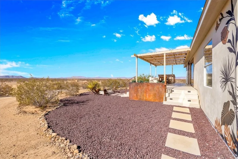 Charm is an understatement. Tucked away on 2 private acres in North Joshua Tree, this fully renovated home offers the perfect blend of style, comfort, and desert seclusion. Surrounded by a complete fence line, the property is designed with magazine-worthy taste and a Santa Barbara–inspired “smooth stucco” finish that immediately sets it apart. Step inside the gates and you’ll find a thoughtfully curated outdoor experience with an ornate concrete deck, gas fireplace, cedar hot tub, outdoor soaking tub, and a shaded front porch for relaxing desert evenings. Inside, the 3-bedroom, 2-bathroom, 1,248 sq. ft. home has been finished with hand-picked furnishings that complement the clean and modern interior. A cozy gas fireplace warms the home in the winter, while central AC keeps it cool through the summer. Currently operating as a successful Airbnb, the property is being sold fully furnished, making it turnkey for full-time living or continuing as a high-performing short-term rental. Bay windows invite the sunrise and sunset indoors, while tasteful design details ensure every corner is welcoming and unique. Additional features include city water, propane, leased solar (locked at just $92/month until 2036), and a storage shed for convenience. A true Joshua Tree gem, this one is ready to enjoy from day one.