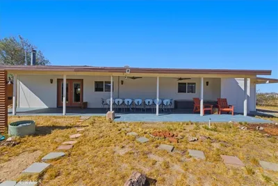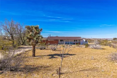 EPIC VIEW RETREAT ON 2.5 ACRES IN NORTH JOSHUA TREE! Surrounded by wide desert horizons and endless sky, this 2.5-acre property in north Joshua Tree offers a rare chance to live fully immersed in the landscape. Here, the boundaries between indoors and outdoors soften. Morning light stretches across the land, wildlife moves quietly through the distance, and evenings unfold beneath a canopy of stars. The thoughtfully designed home features a split floor plan that supports both privacy and connection. Two generous en-suite bedrooms are set apart from one another, creating peaceful retreats, while a third bedroom offers flexibility for guests, creative work, or additional living space. It's a layout that feels grounded and open, well-suited to hosting while still following the quiet rhythms of the desert. Inside, natural textures and clean lines complement the surroundings. Bamboo flooring in the dining and living areas while the kitchen features butcher-block counters, stainless steel appliances, and a classic subway tile backsplash. In the dining area, a wood stove adds warmth and a sense of gathering on cool desert nights. Updated windows and efficient mini-split HVAC ensure comfort in every season. Step outside to large covered front deck that looks out over the land, offering a front-row seat to shifting light, passing clouds, and expansive views. With space to seat a crowd, it becomes a natural place for shared meals, long conversations, and quiet moments. Don't miss the laundry and cable-internet availability, making extended stays or full-time living seamless. This is more than a home; it's a place to reconnect with the land, to slow down, and to live in tune with the desert's vast, enduring beauty. Come see!