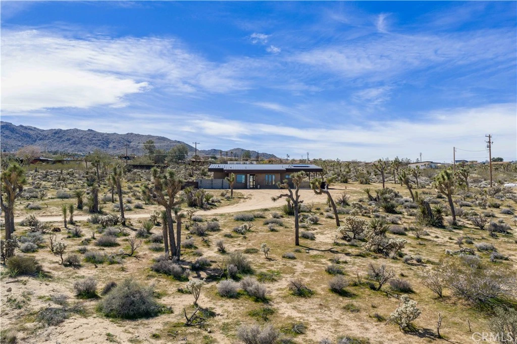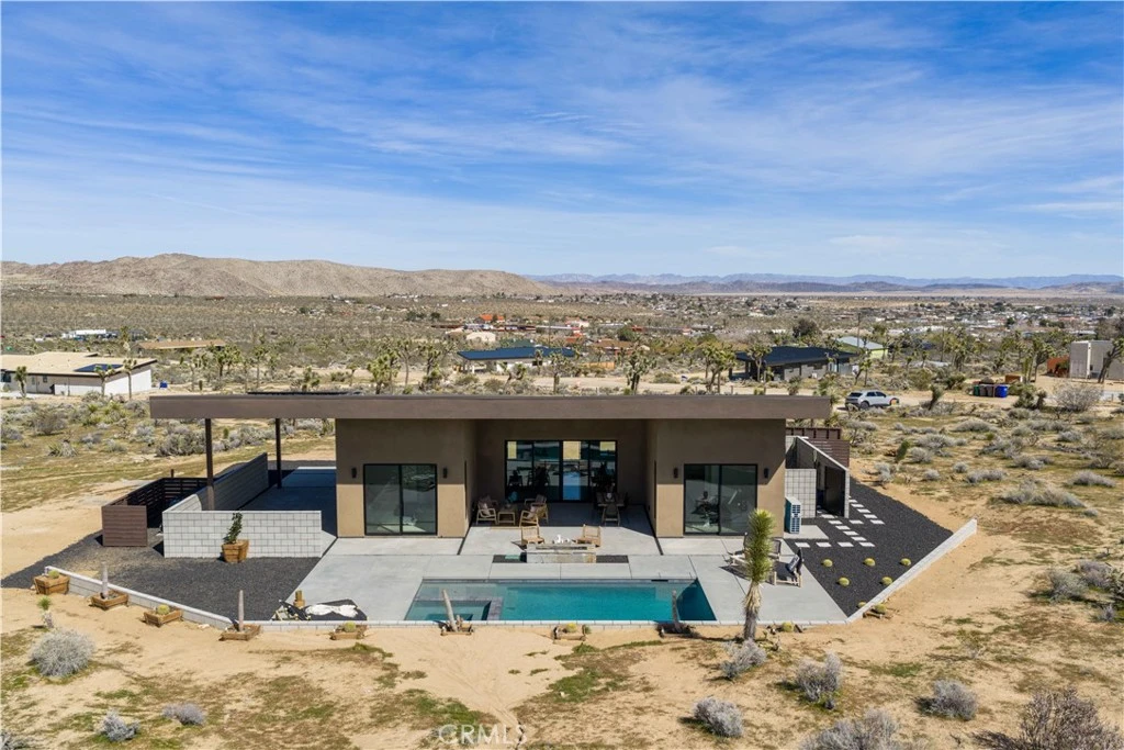 Welcome to The Saddle on Saddleback! Another quality collaboration between BluHaus Design Studio and Wilson Construction. Located on a street with million dollar, newly constructed homes, all with unobstructed views of North Joshua Tree and JTNP. Close to Downtown Joshua Tree, the JTNP entrance off Quail Springs, and a short drive to Pioneertown, this centrally located home is ideal as a short term rental or weekend getaway home. Built with a modern, high desert design aesthetic, The Saddle's exterior is bold and pleasing, mixing darker colors with natural stone. The attached carport has an EV charger that can be set to sell charges to guests, if desired. In the backyard, relax around the heated, saltwater pool spa combination while enjoying the tasteful landscaping. After your swim, rinse off in the outdoor shower before lounging on the covered outdoor back deck with fire pit. Once inside, you'll find high end kitchen appliances, a fully wired low voltage platform for a bespoke A/V system, two beautifully designed bathrooms, spacious bedrooms, and endless views from every room. Both bedrooms have sliding glass doors that lead onto the pool deck. This home needs nothing. Furniture available outside of escrow. Schedule a showing of this desirable Joshua Tree home today!