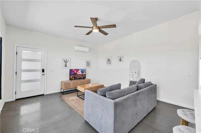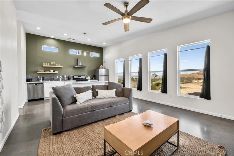 Newer construction home built in 2022, perfectly located close to the Joshua Tree National Park entrance and just over one mile from downtown Joshua Tree. This modern property is currently operating as an active short-term rental and offers a stylish desert retreat with incredible views and a thoughtfully designed layout. As you step inside, you’ll immediately appreciate the open-concept design that feels light, bright, and airy. A large bank of windows captures stunning views of Joshua Tree National Park and the surrounding mountains, creating a beautiful focal point throughout the main living space. The kitchen is generously sized and offers ample storage and counter space, flowing seamlessly into the living area for a comfortable and functional living environment. The bedroom is well-sized and features an ensuite bathroom complete with a shower-tub combo and the convenience of an indoor stackable washer and dryer. Step outside to the backyard where you’ll find a patio area with a jacuzzi tub, plenty of space for outdoor seating, and privacy fencing that creates a relaxing desert oasis. In addition, a large carport provides covered parking and can also function as an additional shaded patio space. Whether you’re looking for a second home, desert getaway, or income-producing property, this modern home offers an exceptional location, beautiful views, and proven short-term rental potential just minutes from the park and the vibrant shops and restaurants of downtown Joshua Tree.