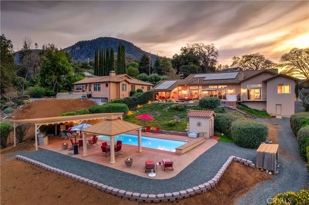 Stunning 3 bed/3.5 bath Spanish style home with panoramic views of Clear Lake. Set on over an acre lot in prestigious Buckingham Park. This custom home is studded with high quality finishes and features an open concept floor plan. You'll be captivated by the gorgeous views the minute you walk through the front door. The living room hosts a fireplace, and large glass sliding doors. The open concept kitchen has a gas range, and granite counters. The formal dining area, is highlighted by an exquisite swarovski christal chandelier and adorned with more beautiful views. On the south wing a game room with a half bath and separate street entrance, plus access to the back yard, pool, cabana and outdoor kitchen area, ideal for entertaining! The Master suite has more views, and is well appointed with a walk in closet, soaking tub with mesmerizing views of the lake, separate walk in shower and double vanity. Sliding glass door provides access to the hot tub overlooking the lush landscaped backyard. Wide and and spacious driveway makes it easy to park a boat, or oversized vehicles, in addition to the 2 car garage there is a carport and golf cart parking area. Solar and generator are owned. The HOA provides marina and lake access, club house and monthly classes/social activities for the residents.