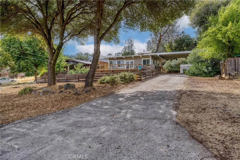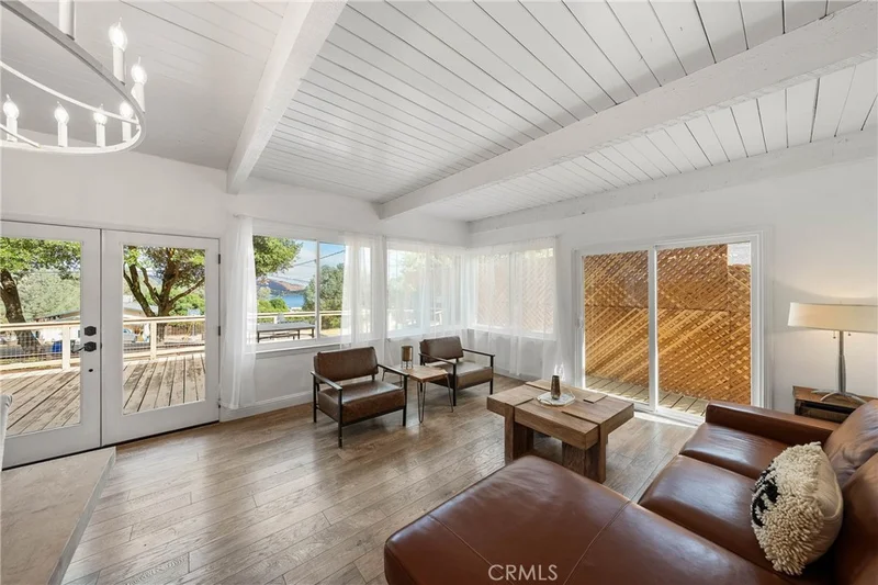 This lakeside residence has been recently upgraded to reflect modern styling. Key features include new windows, French doors, and continuous laminate flooring throughout the main living areas. The light-filled great room boasts exposed beams and doors that open directly onto a large front deck overlooking the lake. The modern kitchen is equipped with tile countertops, bar counter seating, and stainless steel appliances, including a propane range, microwave hood, and refrigerator. The integrated dining room, enhanced by a modern chandelier, is situated off the French doors leading to the wrap-around style deck—an ideal space for entertaining and barbecues. The home offers two naturally lit bedrooms, both featuring slider doors that provide access to the wrap-around deck. The updated bathroom includes a walk-in tiled shower, wainscoting, and a single furniture-style vanity. Exterior amenities include a long, flat driveway suitable for multiple cars, an attached carport with built-in storage, and a separate laundry room. The fenced front yard is shaded by beautiful oak trees and offers frequent nature sightings. Located in the Kelseyville Riviera, this home is centrally positioned in Lake County, California, providing access to schools, shopping, and the lake. Enjoy peaceful country living in a community just 2.5 hours from San Francisco and 2 hours from Sacramento.