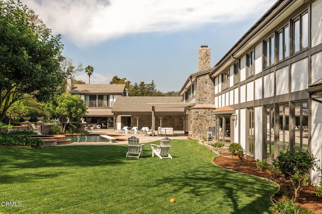 Measured at over 12,000 square feet, this magnificent gated estate offers exceptional privacy, scale and luxury amenities on a nearly one acre parcel of beautifully landscaped grounds in the coveted Flintridge enclave of La Canada. The highlights of this grand custom property include a semi-attached guest house, indoor pool and wellness pavilion, expansive outdoor entertaining areas and additional pool that seamlessly blends everyday living with large scale hosting.A dramatic double height formal entry greets guests with mahogany double doors, custom carved mouldings and an opulent chandelier. Oak parquet flooring leads to the stately formal dining room with domed ceiling and illuminated built-in cabinetry providing an elegant setting for entertaining. Gracious step-down living room, anchored by an ornate carved wood and stone fireplace is framed by windows overlooking the picturesque backyard, gardens and outdoor pool. Media room with projector and viewing screen, fireplace and bar creates an ideal setting for private screenings. The executive library offers a quiet retreat with custom walnut bookcases and window banquette. Expansive eat-in kitchen with statement fireplace, custom cabinetry, generous preparation and storage space, center island, walk-in pantries and a full complement of premium chef's appliances. Butler's pantry with prep sink and temperature controlled walk-in wine storage. Adjacent service spaces, including laundry and housekeeper's quarters.Remarkable wellness pavilion with floor to ceiling windows includes an indoor ozone heated lap pool, gym with mirrored wall, sauna, changing room and bath. Upstairs, the spacious primary suite is a private retreat with fireplace, balcony, beverage bar, dual bath and dressing wings; domed sitting turret with built-in shelving and views of the San Gabriel Mountains. Opposite are four additional bedroom suites, that all include custom bathrooms and walk-in closets. The adjoining office and a turret domed meeting space offer ideal accommodations for work or study.The semi-attached guest house enjoys its own private entrance and includes a living room with fireplace and wall of sliding glass to the backyard. Upstairs bedroom suite offers balcony views of the backyard, walk-in closet and substantial bath.Designed for recreation and entertaining, the outdoor grounds feature mature landscaping, playground, short game practice green, heated pool and spa and four-car garage.