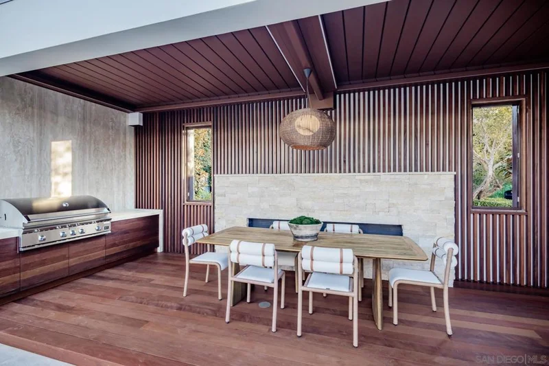A refined architectural residence in La Jolla Shores just moments from beach access and capturing breathtaking panoramic ocean views. Featured in San Diego Home & Garden and built by Hill Construction, the home pairs strong design with thoughtful, highly functional living. The main level offers true single-level convenience, with living, dining, family room, kitchen, office, and primary suite all seamlessly connected. Thirteen sets of solid mahogany French doors open to both an expansive ocean-view deck and a protected interior courtyard, creating exceptional indoor-outdoor flow. Galala limestone flooring extends throughout the main level, courtyard, and pool deck, complemented by custom cabinetry with book-matched fumed eucalyptus, black granite countertops in the kitchen, and Navona travertine in the primary bath. The lower level provides four private bedroom suites, each with its own bath, along with a spacious common room and access to a patio with hot tub - ideal for guests or multigenerational living. A vanishing-edge pool with resistance jets by Mission Pools anchors the backyard, while fenced yard spaces, a dog run with direct access, four private parking spaces, and a generous two-car garage complete this thoughtfully executed coastal retreat.
