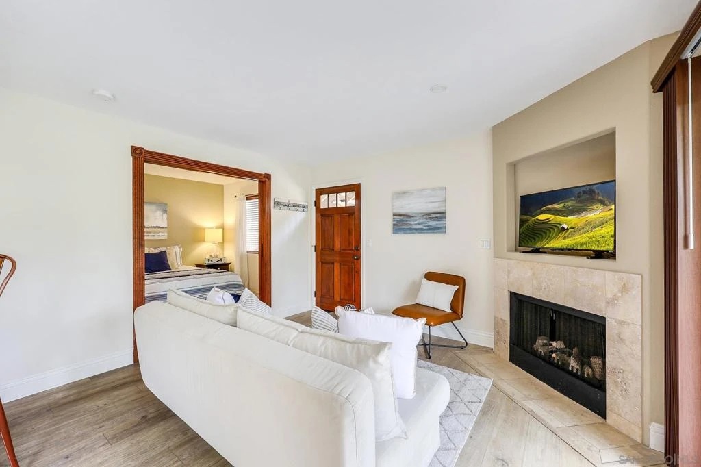 Beautifully maintained corner residence in the highly desirable La Jolla Village neighborhood, ideally situated next to a peaceful green belt and offering a perfect blend of comfort and convenience. This inviting home features a bright, open layout with warm wood cabinetry, granite countertops, and a functional breakfast bar that seamlessly connects the kitchen to the living space. The cozy living room is centered around a charming fireplace and opens to a private outdoor patio through sliding glass doors—ideal for relaxing or entertaining while enjoying lush, green surroundings. The patio also features a convenient closet with in-unit stackable washer and dryer, adding everyday ease and functionality. The bathroom is well-appointed with ample storage and a clean, classic design. Residents enjoy access to resort-style amenities including a sparkling pool, sun deck, and outdoor gathering areas surrounded by mature trees and tropical landscaping, creating a peaceful retreat-like setting. Ideally located near world-class beaches, shopping, dining, and easy freeway access, this home offers the best of coastal La Jolla living.