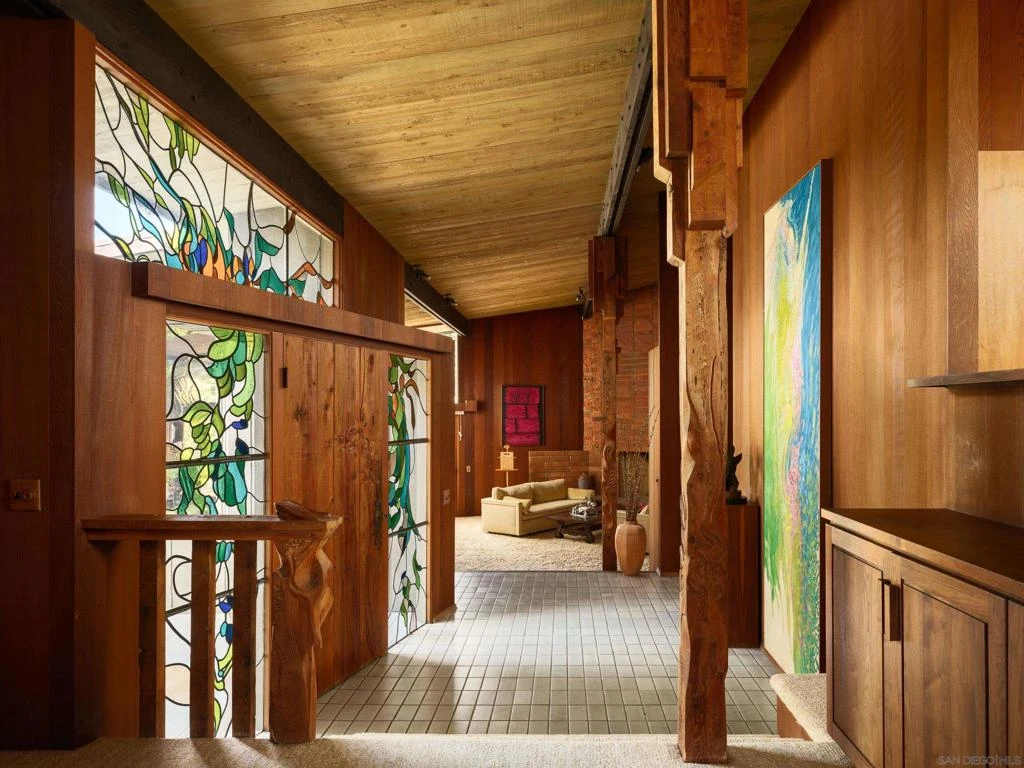 FIRST TIME ON THE MARKET! This mid-century modern tour de force is the result of a unique collaboration between client, architect (Sim Bruce Richards) and artists (James Hubbell and Rhoda LeBlanc Lopez). This cedar and glass beauty engages its 1.09-acre parcel through expanses of glass in every room. Whether relaxing poolside or entertaining guests indoors, the home frames views of the eastern hills and mountains. Colors illuminate the interior spaces through stained glass, skylights and pendant lighting by Hubbell, while both fireplaces feature Lopez's sculptural bricks. A remarkable opportunity to purchase an architectural work of art in the heart of Mount Helix.