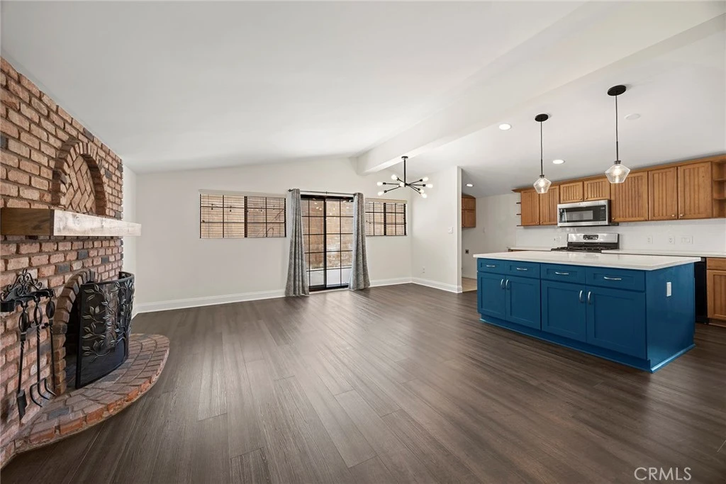 Beautiful 4 Bedroom 2 Bath Single Story Mid Century La Mirada Home in a Quiet Cul-De-Sac Neighborhood. This amazing home isn't a flip, it was a family home that has been lovingly cared for by the people who actually lived there. We think the difference is striking. Upon entering, your friends will be jealous of the open concept great room, perfect for everything from simple family dinners to entertaining a house full of guests. The remodeled kitchen portion includes a huge custom island, quartz countertops, natural cabinets, white subway tile backsplash, stainless gas range, microwave, dishwasher, laminate flooring, dramatic pendant lights, and recessed lighting. The living area portion of the great room boasts vaulted exposed beam ceilings, laminate flooring (same as kitchen), inspired light fixtures, exposed brick fireplace, and a new wood mantle. There has been an intentional effort to keep the great room area warm and welcoming while still light, clean and contemporary. Moving down the hallway that leads to the bedrooms, you'll first come across a very convenient 3/4 bath that doubles as guest restroom and on suite bathroom for Bedroom #2. Bedrooms #2 and #3 feature laminate flooring, closet storage, vaulted ceilings, and modern ceiling fans. Bedroom 4 is on the other side of the hallway and features carpet flooring, vaulted ceilings, and a newer ceiling fan. The primary bedroom is also on this side of the hallway, and in addition to vaulted ceiling, a spacious closet, custom accent wall, and newer ceiling fan, it also sits directly adjacent to the remodeled full bathroom. The remodeled full bathroom has new tile flooring, vanity, light fixtures, plumbing fixtures, and a brilliant shower/tub with with subway tile and custom recessed shower shelf. The entire home has new neutral paint plus central AC and heat. There is ample vehicle storage with a two car garage plus an oversized driveway. The home provides a Laundry room directly off the kitchen with washer hookups, electric and gas dryer hookups, as well as convenient cabinet storage. Around back, the yard area features a slightly elevated wooden deck with sunshade, perfect for outdoor dining on a warm Spring evening. Address feeds La Pluma Elementary, Benton Middle, and La Mirada High School. Close proximity to shopping, groceries, the La Mirada Theatre, La Mirada Regional and Splash Waterpark. This will be a very clean sale with no seller contingencies so hurry because it won't last long.