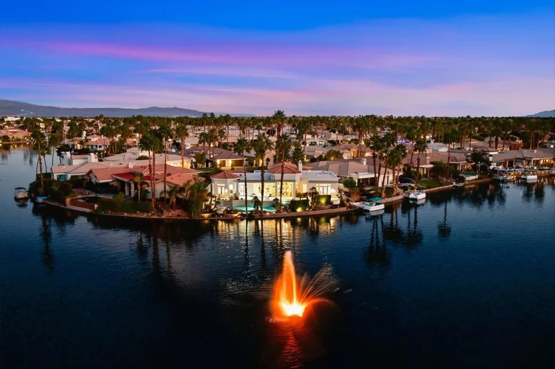A rare custom-built home that defines luxury living!! Located in the renowned, gated community of Lake La Quinta, this premier luxury residence sits on the highly desirable peninsula lot with over 130' of lake frontage and sweeping Santa Rosa Mountain views. The home is offered custom luxury furnished, delivering exceptional quality, comfort and style throughout with approximately 4200 square feet of living space, four bedrooms and five bathrooms, perfectly positioned at the end of a cut-de-sac.As you arrive, a custom paver driveway leads to a private gated courtyard accented with elegant limestone walkway. Here you'll find a fully remodeled, detached casita-ideal for guests featuring porcelain flooring, a spacious en-suite bath, walk in closet and high-end finishes. Continue through the courtyard to the main residence entrance through custom double doors, you're immediately greeted by a grand foyer with soaring ceilings and a dramatic wall of windows showcasing the breathtaking lake and mountain views. The formal living room features custom fireplace w/hearth and flows seamlessly into a sophisticated dining area w/sunken bar, creating exceptional space for entertaining. The gourmet kitchen is equipped with center island, high-end appliances, Cambria Quartz counters and opens to a comfortable family room designed for everyday living and gatherings. The primary suite is a private retreat, offering oversized windows, direct patio access with stunning lake and mountain views. The remodeled en-suite bath is spa-inspired, featuring a custom walk-in shower, dual vanities and refined finishes. Bedrooms two and three are generously sized and each includes its own upgraded en-suite baths, offering comfort and privacy for family and guests.The outdoor space is truly resort-like, with multiple seating areas, a built-in barbecue and a custom three-tiered PebbleTec pool and spa. Retractable awnings, premium tile flooring and unobstructed views of the Santa Rosa mountains and lake create an ideal setting for relaxation. The property also includes a private dock and boat, allowing you to enjoy peaceful cruises around the communities 24- acre lake.Residents of Lake La Quinta enjoy access to community amenities such as tennis/pickleball courts, bocce ball, and picnic areas.This exceptional property is a true showpiece, offering luxury, privacy and an unparalleled lakefront lifestyle.