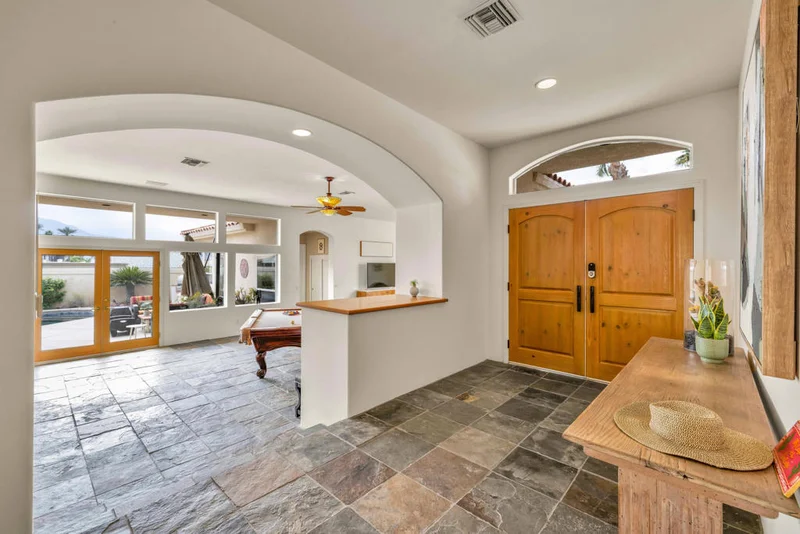 Now available for a long-term rental! Pet friendly! Inquire for Seasonal Rates November 2025 to April 2026. This is an excellent opportunity to enjoy this beautiful 3-bedroom, 3-bath custom La Quinta home. This home boasts an open floor plan with high ceilings, a kiva fireplace, and large windows that bring in wonderful natural light. The living room opens to the kitchen, which features stainless steel appliances, plenty of storage, and a kitchen island. Enjoy cooking on the 5-range gas stove overlooking the pool and dining area. The primary bedroom is on the opposite side of the two guest bedrooms and features high ceilings, French doors with access to the pool, double vanity, walk-in closet, sunken tub, and stand-alone shower. The two guest bedrooms are good size; one is ensuite. Enjoy al-fresco dining in the backyard overlooking the pool and Santa Rosa mountains. This home is great for entertaining, featuring a built-in BBQ, pool table, and outdoor entertainment space.