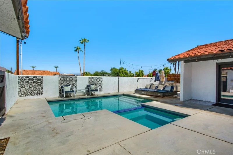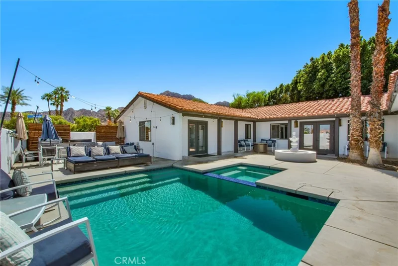 CHARMING CORNER LOT IN THE COVE – FULLY FURNISHED WITH POOL & MOUNTAIN VIEWS! MOTIVATED SELLERS! 3BD/2BA home on a desirable corner lot in La Quinta Cove. Fully furnished with stainless steel appliances, washer/dryer, and stylish finishes throughout. Open-concept layout features a sunken living room with wood-burning fireplace and wine cooler. Kitchen boasts quartz countertops, center island, and modern cabinetry. All bedrooms have walk-in closets and laminate tile flooring. Primary suite includes en suite bath and French doors opening to a private courtyard with new sparkling pool, spa, and water fountain—perfect for enjoying panoramic mountain views. Includes attached 2-car garage. Close to Old Town La Quinta, golf, hiking, and more. Ideal as a full-time residence, vacation home, or investment property!