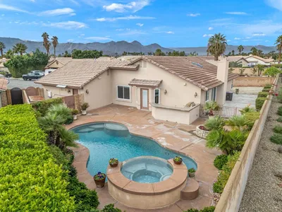 Discover a unique blend of character and comfort in this beautifully designed desert home in La Quinta. Situated on an elevated lot with sweeping views of the Santa Rosa Mountains, this rental offers privacy, space, and standout style. The main home boasts an open concept layout with dramatic windows that bring the outdoors in. Custom finishes include exposed wood beams, stained concrete floors, and a striking fireplace that anchors the living space. The newly updated kitchen features a modern galley layout and direct access to a private front patio, perfect for al fresco dining or quiet mornings. Tucked away is a detached guest casita with its own living area, echoing the main home's mid-century design elements and natural light. Below the casita, you'll find a spacious two-car garage, storage area, and dedicated laundry setup. Outdoors, the front entry welcomes with desert-friendly landscaping and a circular drive for easy access. The backyard is designed for leisure, complete with mature greenery and a vintage inspired pool that stays true to the home's original charm. Enjoy efficient climate control with a three-zone split AC system and take advantage of walkable access to nearby trails and outdoor recreation. This is more than just a rental, it's a design-forward retreat ready for those who appreciate architecture, comfort, and views.