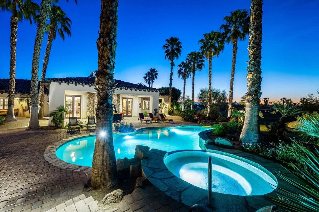 Behind its own private gate within Peninsula Park, an exclusive enclave of just 17 homes inside the private gates of PGA West, this exceptional estate spans 4,538 square feet on a 24,394 square foot lot with commanding south-facing views of the Santa Rosa Mountains and the 15th hole of the Tom Weiskopf Private Course. Designed for elevated desert living, the residence includes a private casita and showcases a beautifully appointed chef's kitchen with Wolf appliances, double ovens, warming tray, built-in Sub-Zero refrigerator, and distinctive copper vent hood and sink. Expansive living spaces open seamlessly to a wraparound patio that captures the spectacular golf course and mountain backdrop, while the resort-inspired outdoor setting features a pool, spa, outdoor fireplace, putting green, and BBQ island for effortless entertaining. A rare offering in one of PGA West's most private and prestigious enclaves, this home delivers exceptional scale, privacy, and luxury. Offered furnished per seller's inventory.