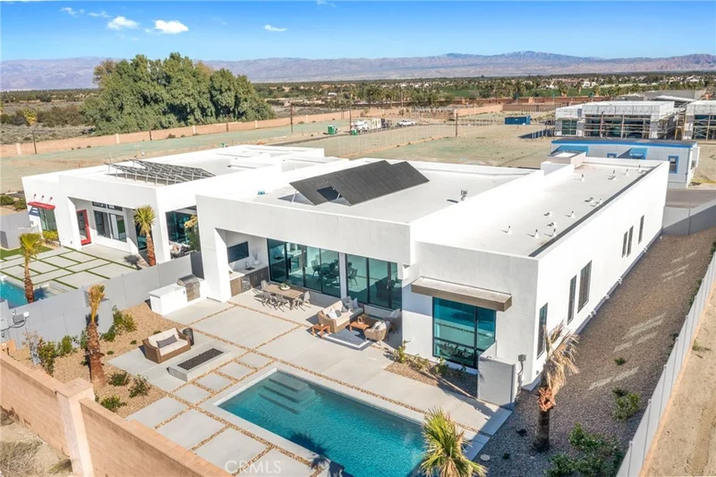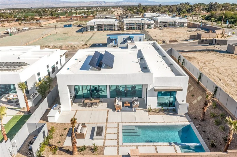 Welcome to Oasis by Crestwood Communities, a gated community offering modern desert living with breathtaking mountain views in the heart of La Quinta. This unique single-story modern home features 2,458 square feet with 3 bedrooms, 3.5 bathrooms, and a 3-car garage, and is accessed through a private gated courtyard that provides both privacy and style. Inside, soaring ceilings, striking 12x24 tile floors, and an open-concept great room are filled with natural light from front to back, enhanced by expansive sliding glass doors that create a seamless indoor-outdoor flow to the covered patio. The outdoor space is resort style, perfect for entertaining or relaxing beside the included pool and spa. The open kitchen is designed for both functionality and elegance, featuring designer quartz countertops, an oversized island with waterfall edges, modern flat panel cabinetry with warm accent lighting, soft-close hinges, and stainless-steel Bosch appliances. Each bedroom includes its own en-suite bathroom, while the primary suite offers a resort-style retreat with direct access to the covered patio and a spa-inspired bathroom, thoughtfully separated from guest bedrooms for added privacy. Solar is available for purchase or lease, and the home includes many additional amenities. Conveniently located near golf, hiking, biking, and horseback riding, yet away from traffic and congestion. Model grand opening is Saturday, January 24th. Photos shown are of the model home; the subject property is currently under construction.