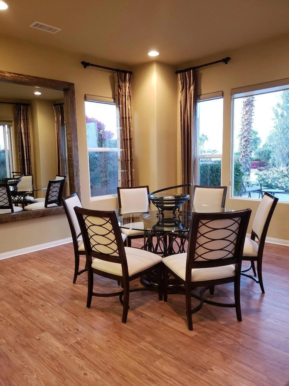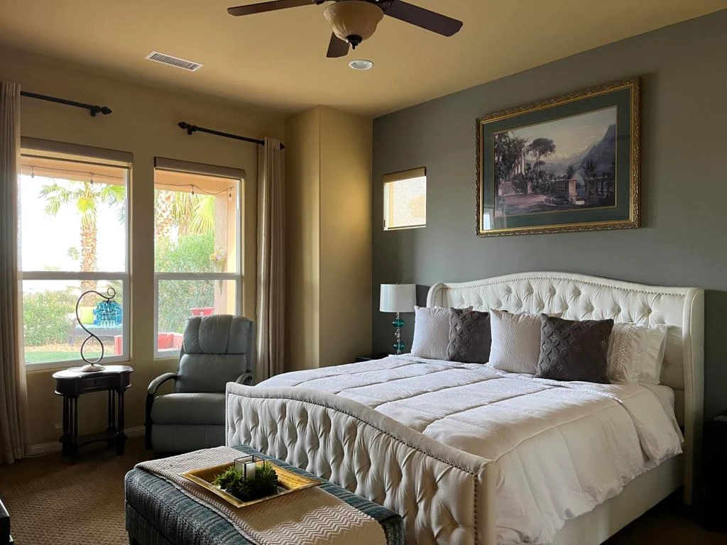 RENTED 1-2-26 thru 4-1-26. RENTED 1-1-2027 thru 4-1-2027. Available all other months. Beautiful home in the 55+ community of Trilogy of La Quinta. This exceptional Caspian floor plan 1775 SQ. FT. This property is on the golf course with East facing lovely views. Great to have coffee in the sun of the early morning. Cozy fireplace inside, convenient Office / Den. Professionally landscaped backyard with artificial grass and water feature. 2BD/BA