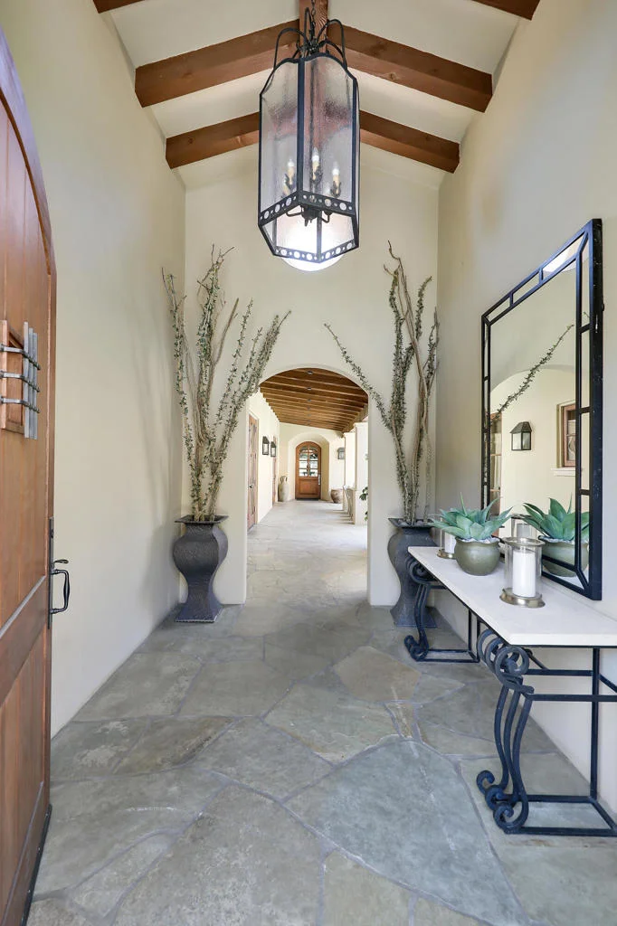 Surrounded by dramatic mountain vistas from every room, this beautifully customized home embodies the essence of refined desert living. Overlooking the 13th Green of the the world-renowned Mountain Course, it captures the magic of La Quinta's most enchanting setting--spectacular sunsets, star-filled nights, and the sweet scent of citrus in bloom. Private arched wood entry doors lead into a serene courtyard featuring a sparkling pool and spa framed by soaring mountain peaks. Designed for seamless indoor-outdoor living, the entire home opens from the courtyard through the main living spaces to a rear patio that invites relaxation and entertaining. Here, you'll find a built-in fire pit that glows beneath the desert sky, creating the perfect gathering space for evening conversations or quiet stargazing. An additional outdoor fireplace and seating area in the courtyard enhance the home's inviting ambiance, ideal for hosting friends and family. Inside, timeless Spanish-inspired details shine through with wood-beamed ceilings, grand chandeliers, and artisan craftsmanship throughout. The kitchen is a chef's dream, appointed with Sub-Zero refrigeration, a Viking six-burner gas cooktop, wine refrigerator, extensive counter space, and a generous central island that makes cooking and entertaining effortless. Four spacious bedroom suites, each with a private en-suite bath, offer both comfort and privacy. Expansive living and dining areas provide a graceful setting for gatherings, while the cozy den or office adds flexibility for work or leisure. An air-conditioned two-car garage with built-in storage, plus additional space for two golf carts, underscores the home's thoughtful design and functionality. Located just minutes from the iconic La Quinta Resort, residents enjoy easy walk, bike, or golf cart to world-class dining, shopping, spa experiences, tennis, and golf. Blending elegance, warmth, and authentic desert charm, this exquisite home delivers a perfect balance of luxury and relaxation amid the breathtaking landscapes of La Quinta.