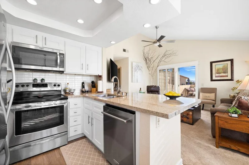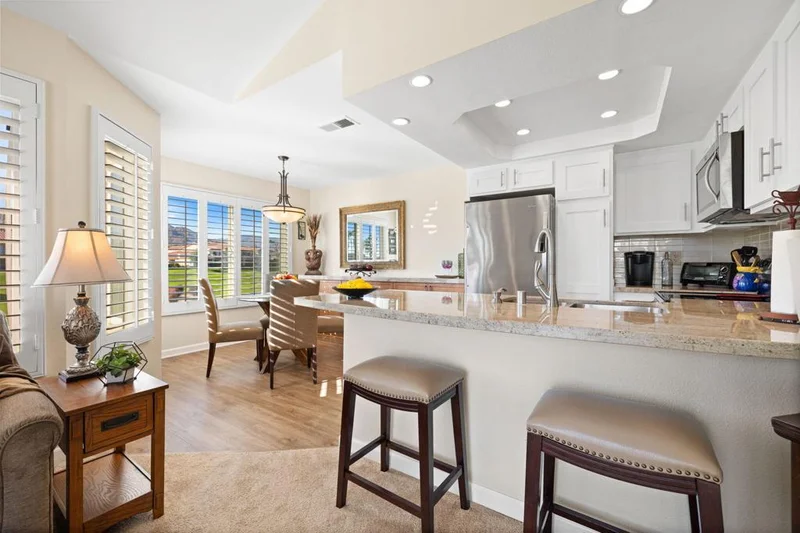This upper-level view property is in a premium location with views in every direction. The balcony offers breathtaking views of fairways, lakes and mountain ranges. The interior features a great room floor plan with vaulted ceilings. The highly upgraded kitchen features custom cabinetry, granite counters, custom tile backsplash and newer stainless appliances. The kitchen is open to the living area. Both baths have been extensively upgraded with custom tile enclosures, newer cabinetry and granite counters. The guest bedroom is versatile and features office furnishings. This condo features luxury vinyl planking in the dine area. Decorated in warm neutral colors this property is offered furnished per inventory. With energy-efficient vinyl doors and windows the property combines luxury with sustainability. A new HVAC system was installed in 2025, and ceiling fans and shutters enhance efficiency. New water heater installed in 2025. Newer washer/dryer located in the unit. The inclusion of a 1-car garage adds practicality to the package. The complex's amenities include 6 community pools and spa areas, to provide ample opportunities for relaxation and recreation. The added perk of UNLIMITED golf on a Ted Robinson designed par 3 course. Featuring tennis and pickleball courts that are well maintained. Now the area headquarters for Helix Disc Golf, enhances lifestyle appeal. Low HOA dues covering essential services, cable, and internet make for worry-free living, while convenient access to shopping, dining, and transportation adds to the property's allure. Situated across from the Indian Wells Tennis Gardens, home of the Paribas Open, this property is perfect for either full-time residence or a luxury seasonal home. Overall, it truly offers a lifestyle of convenience and luxury, appealing to those seeking the ultimate in comfort and relaxation.