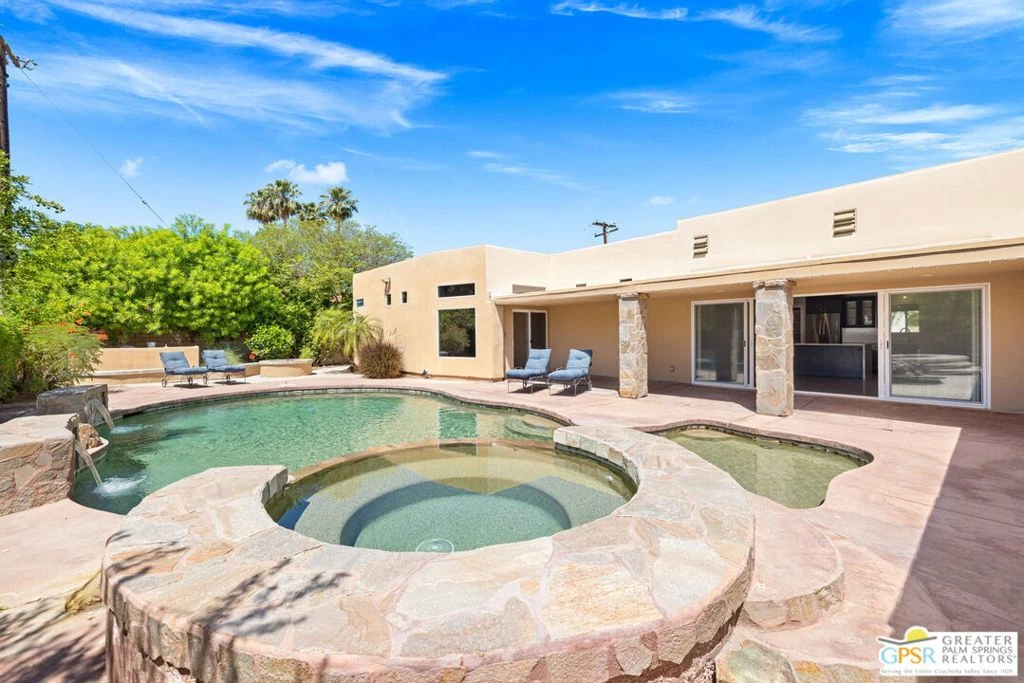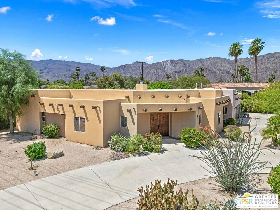 South-facing sunshine and standout style! Set on a generous corner lot in established Desert Club Estates, this stylish single-story delivers Santa Rosa Mountain views and a private resort-style setting with NO HOA. A circular driveway and an earthy exterior with exposed wooden vigas set the tone, while inside, vaulted ceilings with wood beams and clerestory windows elevate the open-concept living spaces with an abundance of natural light. The living room, anchored by a dramatic floor-to-ceiling stacked stone fireplace, flows into an adjacent dining area and opens to the covered patio and pool for that ideal indoor-outdoor lifestyle. The updated kitchen is a showstopper with deep blue cabinetry, quartz waterfall island, white subway tile backsplash, stainless appliances, and a walk-in pantry, all positioned for effortless entertaining. Smart separation of bedrooms includes two primary suites on opposite ends of the home, each with direct outdoor access, plus two additional guest bedrooms served by a full bath and a separate powder bath. Outdoors, the south-facing backyard shines with a PebbleTec pool, elevated spa with stone spillway, and a dramatic covered patio that is a hit for entertaining, along with a built-in fire pit lounge with curved seating and mature landscaping framing those Santa Rosa Mountain views. Three-car garage and circular drive complete the package. Just minutes to Old Town La Quinta, world-class golf, and the Indian Wells Tennis Garden, an ideal full-time, seasonal, or investment opportunity with excellent flexibility.