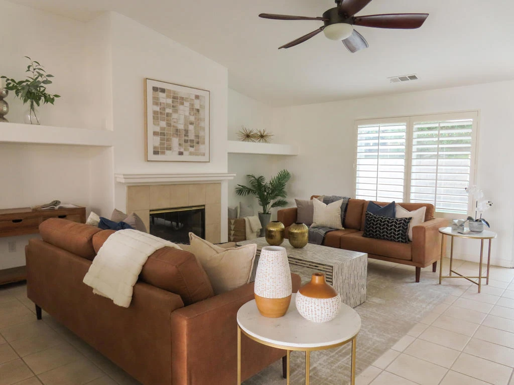 Step into this inviting single-story residence in Starlight Dunes, offering three bedrooms, three full bathrooms, and a wonderfully flowing layout. Beyond the double-door entry, you'll find a comfortable living room and an adjacent formal dining area, ideal for both everyday living and entertaining. The separate great room features a cozy fireplace and it opens to the kitchen, which is appointed with tile flooring, granite countertops, and a breakfast nook framed by a large picture window overlooking the backyard. Sliding glass doors from both the living room and the generous primary suite provide easy access to a private backyard retreat, complete with a patio and a sparkling pool. The secondary bedrooms are well-sized, with ample windows that bring in plenty of natural light. Starlight Dunes is conveniently located near the Indian Wells Tennis Garden, home of the BNP Paribas Open, and just a short drive to the Empire Polo Grounds, where Coachella and Stagecoach are held. The home is also situated within the highly regarded Desert Sands Unified School District, adding to its appeal for full-time residents and seasonal owners alike. *** Furniture is staged. Seller is offering a $5,000 credit toward new flooring.