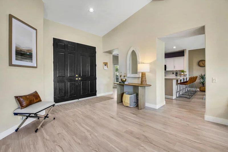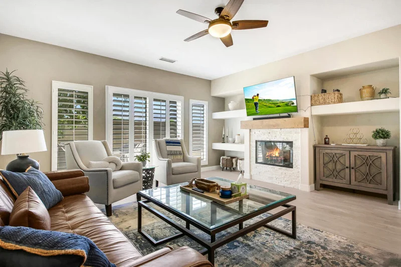 Experience upscale desert living in this beautiful 3-bedroom, 2-bath home nestled in the prestigious 24-hour guard-gated Lake La Quinta community. Spanning over 2,200 sq. ft., this stylish residence offers a seamless blend of comfort and sophistication. A private gated courtyard sets the tone for peaceful mornings or tranquil evenings.Step through grand double doors to discover soaring wood-beamed ceilings, panoramic Santa Rosa Mountain views, and an inviting open-concept layout perfect for entertaining. The chef's kitchen is a standout, featuring quartz countertops, sleek white cabinetry, stainless steel and black Bosch appliances, double ovens, a wine fridge, and upgraded fixtures flowing effortlessly into the cozy family room with a fireplace.The spacious primary suite offers direct backyard access and a spa-inspired en-suite bath with dual vanities, a soaking tub, separate shower, and a large walk-in closet. Two guest bedrooms, a full bath, and a dedicated laundry room complete the interior.Outside, unwind in the peaceful backyard oasis featuring a rock waterfall and lush landscaping. A 3-car garage provides plenty of space for parking and storage. Furniture is negotiable, offering added flexibility for the next owner. Don't miss your chance to live in one of La Quinta's most sought-after communities.