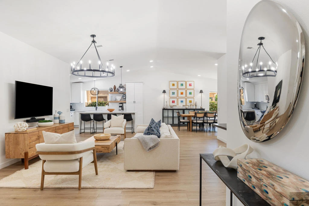 INCREDIBLY REIMAGINED RESIDENCE IN THE HEART OF NORTH LA QUINTA!Prepare to be impressed by this beautifully remodeled home, ideally situated within the sought-after, gated enclave of Aliso. This charming community is prized for its exceptionally low HOA dues and lower-cost electric district, offering both comfort and long-term savings.Set on a quiet interior street and positioned on an oversized lot, this over 2,000-square-foot, 4-bedroom, 3-bathroom residence has been thoughtfully redesigned to feel open, bright, and expansive. A dramatic great-room concept anchors the home, showcasing high-end luxury vinyl plank flooring, quartz countertops, custom soft-close cabinetry, stylish backsplash, designer hardware, elegant baseboards, custom window treatments, and curated lighting throughout.A striking custom fireplace with designer tile, built-in cabinetry, and floating shelves creates a sophisticated focal point, while the spa-like bathrooms feature beautifully tiled hall and primary showers. The primary bedroom offers automated window treatments and serene views of the back yard oasis.Enjoy an attached casita-style separate wing for guests who desire more privacy, with 3 additional bedrooms on the other end of the residence. Outdoors, the property truly shines. Designed for effortless entertaining, the expansive backyard offers mature landscaping including citrus trees, an extensive covered patio, and a large, sparkling pool and spa with newer tile and plaster -- a private desert retreat ideal for gatherings or quiet relaxation.Located in North La Quinta, renowned for its top-rated schools, this stunning home offers the rare opportunity to move right in and enjoy a completely updated residence with all the work already done.Simply bring your clothes -- and start living the desert lifestyle.