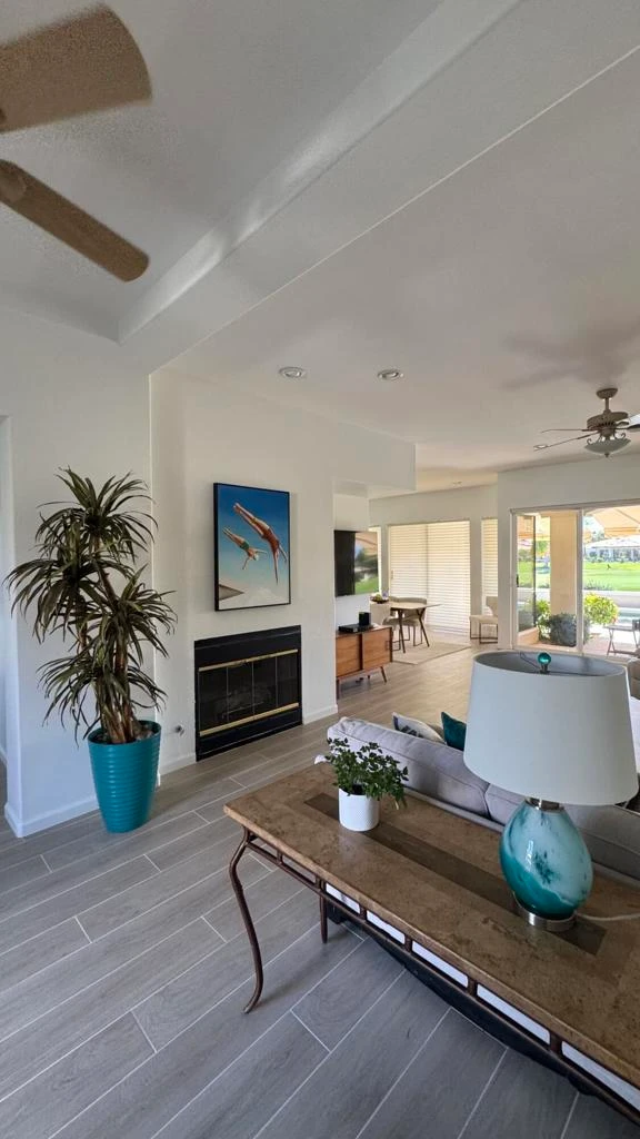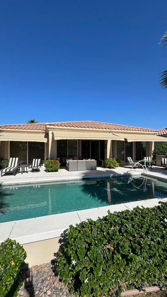 Professional Photos and showings coming April 1st. Step through a private courtyard to a picture-perfect southeast-facing view on the 18th fairway of the private Citrus Golf Course, directly across from one of the three Citrus Parks with lake, waterfalls, and walking paths, perfect for dog walks. The gourmet kitchen has been upgraded with new cabinets, quartz countertops, and new appliances, and has a private desk space making it perfect for work or organization. New luxury tile flooring throughout the kitchen and living room and hallways provides a light bright area leading directly out to the serene outdoor oasis. The outdoor patio, pool area is ideal for savoring the breathtaking views of sunrises and sunsets over the golf course and mountains while relaxing under the automatic patio awning. The patio island has an Alfresco BBQ for the outdoor Chef to entertain. The floor plan boasts a large, private peaceful, primary suite with a spa-like bath and direct patio access to the pool and spa. The attached guest casita has private access through the front courtyard and includes a small refrigerator and countertop to provide your guests with comfort in their personal space. This well maintained home has newer dual HVAC units, updated pool equipment and recently painted interior. With just a few personal upgrades and touches you can create your own sanctuary right here in the desert. the Citrus is close to shopping, restaurants and so many amenities. Social and Golf memberships available. Don't miss this furnished gem, ready for you to call home.