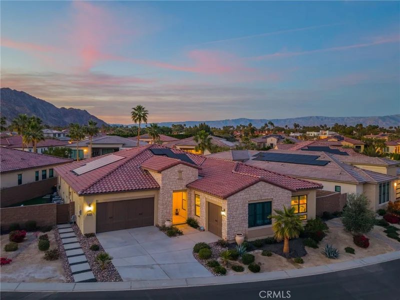 Coming soon..Tucked within the desirable community of Stone Creek Ranch in South La Quinta, this newly built Toll Brothers Larrea model blends contemporary design, quality craftsmanship, and seamless indoor outdoor living just minutes from PGA West. Designed with both comfort and entertaining in mind, the open concept layout is enhanced by soaring ceilings and expansive stacking glass doors that extend the living space to a professionally landscaped backyard. The outdoor setting features pavers, artificial turf, mountain views, a built in fireplace, fire pit, multiple gathering areas, and generous side yards ideal for recreation or additional use. The kitchen is a true focal point, offering waterfall edge countertops, premium JennAir smart appliances, custom cabinetry, a large walk in pantry, and dedicated coffee and wine bars with a built in refrigerator. High end finishes and custom window treatments continue throughout the home, creating a cohesive and refined aesthetic. The thoughtfully designed floor plan provides privacy by separating the primary suite from the guest bedroom and office. The spacious primary retreat features oversized closets, dual vanities, and spa inspired details. A dedicated office offers flexibility for remote work, a gym, or creative space. Abundant storage is incorporated throughout with well planned cabinetry and built ins. Additional features include paid solar, energy efficient systems, a covered patio for year round enjoyment, a two car garage, and a separate golf cart garage. This move in ready home offers modern comfort, stylish upgrades, and a prime South La Quinta location with convenient access to world class golf, dining, and recreation.