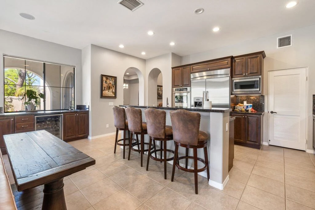 Discover the largest floorplan in the exclusive La Cantera community--an exquisite 4-bedroom, 4-bathroom residence situated on an oversized corner lot with breathtaking southern mountain views. This beautifully designed home offers a bit of Mediterranean charm with arched details and large neutral tile running throughout, offering an unparalleled desert retreat. Step inside to find rich wood cabinetry, granite countertops with a matching backsplash, and a walk-in pantry in the chef's kitchen, equipped with high-end Thermador stainless steel appliances. Entertaining is effortless with a wet bar and an inviting open-concept layout. The main-floor primary suite is a private oasis featuring dual vanities, a separate tub and shower, with a secondary main floor bedroom including a private en suite- great for a home office or guest room. Upstairs, a spacious loft/bonus room offers a large screen tv for movie nights and leads to a private deck, where you can take in the panoramic mountain views from two sets of french doors. 2 additional upstairs bedrooms include mirrored closet doors, newer carpeting and share a spacious bathroom with dual vanities. Outside, the gorgeous rear yard is a true entertainer's paradise, complete with a pool and spa, firepit, and a built-in BBQ island--perfect for relaxing under the desert sky. Located just minutes from world-class golf, dining, and shopping, this La Cantera gem offers the best of La Quinta living!