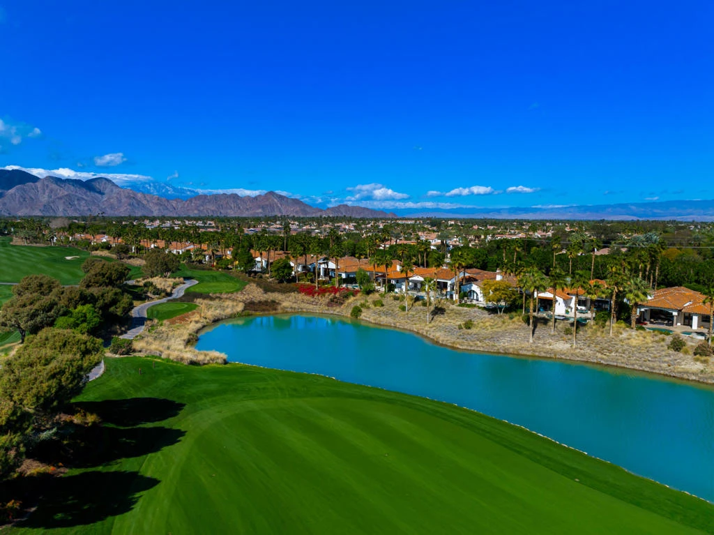 Fabulous, renovated, popular plan 2 Villa, with 3 bedrooms, 3 baths + powder room, and office, situated on the 6th hole of the Clive Clark course, behind the gates of the prestigious Hideaway Golf Club. Features include spectacular South facing VIEWS of the golf course, water and Santa Rosa mountains. This home is perched on a premium lot, and has a spacious floor plan with custom flooring, high ceilings, extensive lighting, a gourmet kitchen that overlooks a large great room and huge, centered fireplace, in a roomy 2,883 SF. There is a lovely primary suite with spa-like bath, and two additional ensuite guest rooms, plus that essential home office, with built-in murphy bed. The floor to ceiling sliding doors in the great room provides a flawless transition to the private outdoor entertaining space, which boasts a covered patio, living/dining area, built-in BBQ, and a beautiful, completely redone pool and spa with fire feature, that perfectly captures our incomparable indoor-outdoor desert lifestyle!