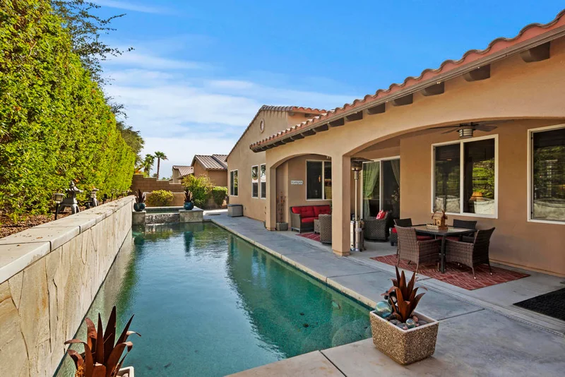 You won't find a better deal than this property lowered in price to sell NOW!!!! If you are looking for perfection, this beautiful 3/3, just under 2800 square foot home in the gated Rancho Santana community is it. Located minutes away from the Indio Polo Grounds, Old Town La Quinta, Shopping and Dining. The open floor plan home features wood like ceramic tile floors, custom window treatments, gorgeous granite counters through the house, and upgraded appliances. The low maintenance front and very private rear yard offers a large salt water, pebble-tec lap pool and spa and fountain. The private side yard patio has a patio cover that is host to seasonal table grape vines growing over it. A beautiful patio fountain provides the ambiance to enjoy morning coffee or evening cocktails under the vines! Other upgrades and amenities include, but are not limited to gourmet kitchen with upgraded granite counters, walk in pantry, a skylight in the laundry room, wet bar and wine fridge in the dining area, and canned lighting throughout the house and garage spaces for three cars. All ensuite bedrooms provide the utmost in privacy, The washer and dryer, and TV console in family room, remain with the house. Low HOA fees!!