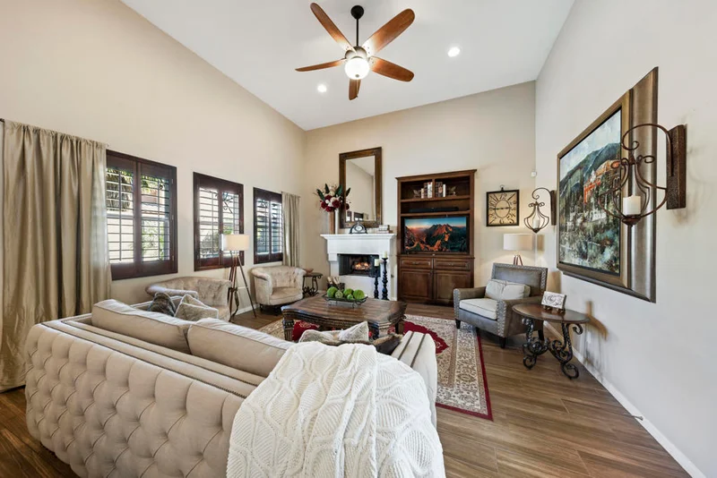Now offered at $1,289,000. An exceptional value for this Resort Style Estate.. The home offers a rare blend of privacy, design and luxury leisure living. This is how desert living is meant to feel. Step into a home that feels less like a residence and more like your own private five-star resort, designed for unforgettable desert entertaining. Located in the coveted gated community of Rancho Santana in South La Quinta, this highly upgraded residence spans over 3,700 sq. ft. and offers 4 Bedrooms, 4 1/2 Bathrooms, plus an upstairs private Bonus Room ideal for a guest, media room, or home office. The home includes a spacious attached Casita which provides added flexibility and features custom built-ins, a sink, mini fridge, and a stacked-stone feature wall with built-in TV. The main living spaces are warm and inviting with a custom stone fireplace, built-in entertainment center, soaring ceilings, plantation shutters, and a dedicated billiard room. The expansive primary suite is privately situated in its own wing of the home and offers a true retreat, complete with a cozy fireplace seating area, large spa-like bathroom, and an oversized walk-in closet. Designed for the ultimate indoor-outdoor lifestyle, the resort-style backyard is an entertainer's dream. Highlights include a chef-grade outdoor kitchen with a sunken BBQ pit, wrap-around granite bar seating for eight, large outdoor TV, stainless steel cooktop, drawers, mini fridge, commercial ice machine, beer tap, and wine cooler. The PebbleTec wrap-around pool delivers all the bells & whistles, including two tanning shelves, a rooftop rain waterfall, three sheer descent waterfalls, a stacked-stone spill-over spa, and six deck jets. Additional amenities include a large gas firepit, a separate six-foot waterfall feature, custom lighting and fans, and a convenient poolside bathroom with shower and stackable washer/dryer. Custom pavers and wrought iron details surround the entire property, located near The Madison Club, polo and equestrian facilities, and just minutes from world-class golf, dining, entertainment, and the charm of Old Town La Quinta. Don't miss this rare Rancho Santana offering that truly must be experienced in person.