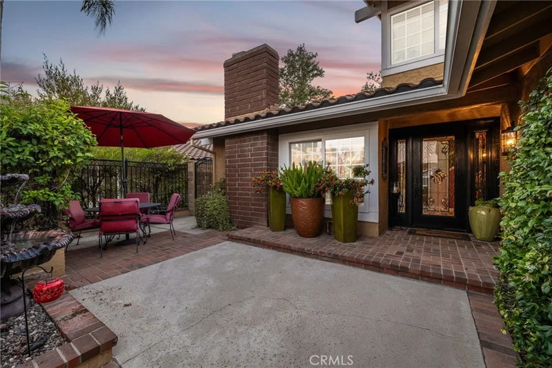 Beautifully positioned against a mountain-view backdrop, this thoughtfully updated home blends timeless character with functional living and inviting outdoor spaces. The front yard offers a warm first impression with mature landscaping, brick-accented steps, and a private gated courtyard leading to a covered brick porch. Soft lighting and classic tile roofing enhance the home’s curb appeal. Inside, a foyer with tile flooring opens to the formal living room, featuring a vaulted ceiling accented by decorative white trim, a stone-surround fireplace, white mantel, and a large front-facing window. The adjacent dining area continues the vaulted ceilings and is anchored by a wrought-iron chandelier, French doors to the exterior, and direct kitchen access. The kitchen is appointed with wood cabinetry, granite countertops, a full tile backsplash, recessed lighting, and an inset ceiling with crown molding. A peninsula with bar seating and a window overlooking the backyard and mountains add both function and natural light. The adjoining family room offers an open layout with crown molding, French doors, a spanning window to the backyard, and a built-in wet bar with granite counters and a beverage refrigerator. The main level also includes a remodeled half bath and a dedicated laundry room. Upstairs, the primary suite features carpeted floors, a vaulted ceilings, and French doors leading to a private balcony with panoramic views. The ensuite bath offers dual sinks with granite countertops, a custom tiled shower with glass enclosure, and a walk-in closet with built-ins. Two additional bedrooms provide ceiling fans and view windows, including one with a built-in desk, complemented by a remodeled hall bath with granite vanity and tiled shower. The finished two-car garage includes extensive cabinetry and a long workbench for added storage and workspace. The backyard is designed for both entertaining and everyday enjoyment, highlighted by a raised brick patio centered around a circular spa, mature landscaping, and palm trees. A covered patio spans the rear of the home and features a built-in barbecue with bar seating, creating a seamless extension of the indoor living areas, all set against scenic mountain views.