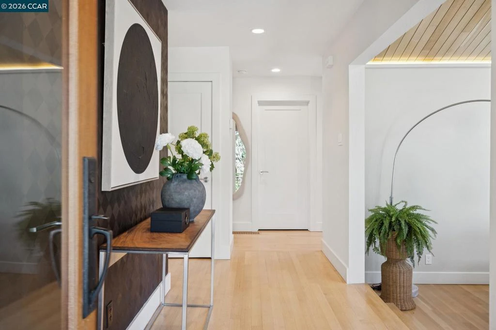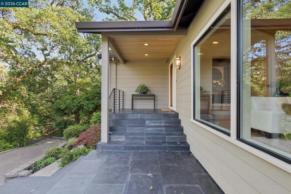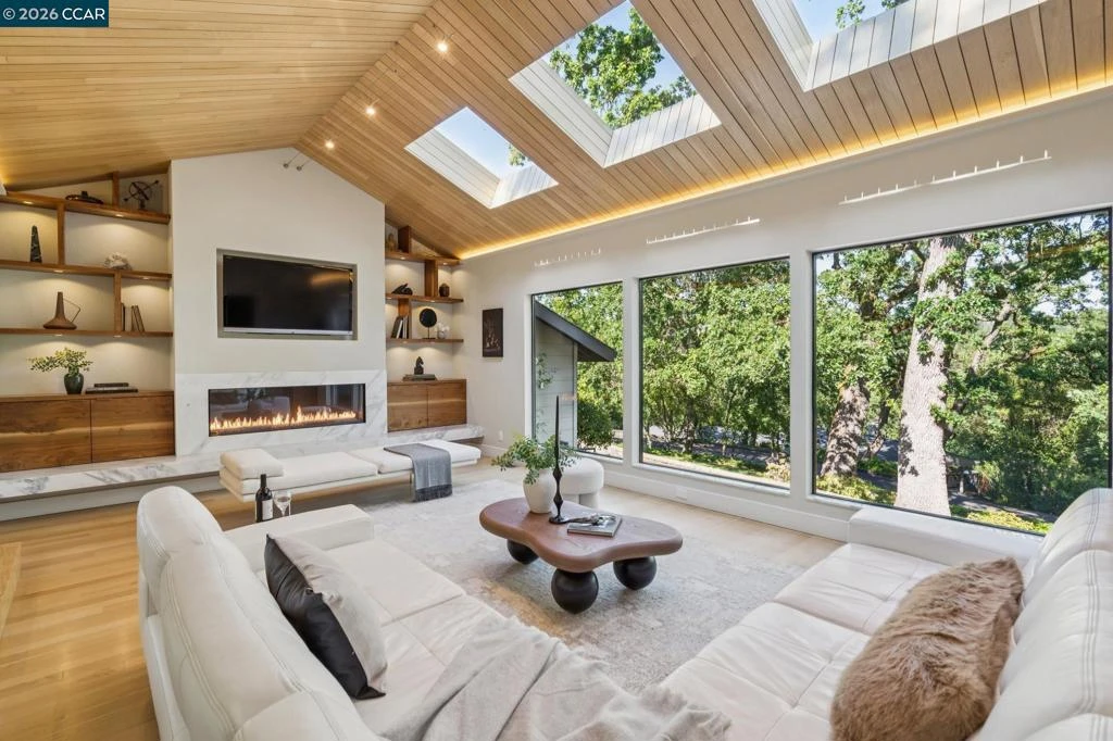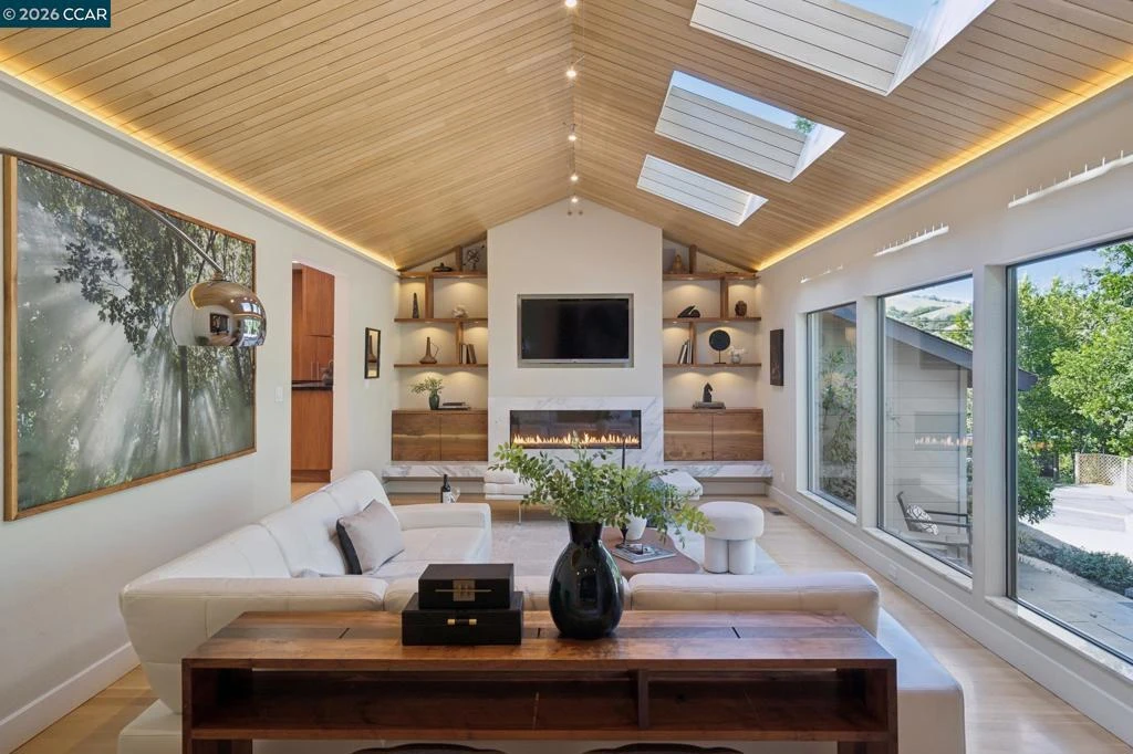 Shaded beneath a canopy of mature oaks in the coveted Trail neighborhood, this masterfully crafted home offers refined interiors, resort-like grounds, and a peaceful setting just minutes from top-rated schools and downtown. Every detail reflects an impeccable level of workmanship seldom found today — from the custom wood ceiling and cabinetry to the designer bathrooms with bespoke tilework. An artistry that truly must be seen to be appreciated. Nowhere is this more evident than the main living space, which stuns with a soaring vaulted ceiling clad in warm wood, three skylights flooding the room with natural light, a sleek linear gas fireplace, custom built-in shelving, and intentional accent lighting. Floor-to-ceiling glass walls dissolve the boundary between inside and out, connecting effortlessly to the surrounding natural setting. Rich custom wood cabinetry, stone countertops, hill views from the kitchen window, and an oversized island anchor a kitchen designed for real cooking and easy gathering. The open dining area flows directly to the backyard through wide glass doors, indoor-outdoor living at its effortless best. The flexible two-level layout offers three bedrooms and three full baths, including a spa-like primary suite with a soaking tub and skylight, and a lower-level suite with private entrance. Outside, the property feels like a world apart. A lagoon-style pool sits amid ferns, flowering shrubs, and fruit trees, creating your own botanical garden retreat. A vegetable garden, multiple outdoor living areas, boat/RV parking, and generous storage round out a yard designed for both beauty and function. Set on an expansive 0.55 acres, this is Lafayette living at its finest.