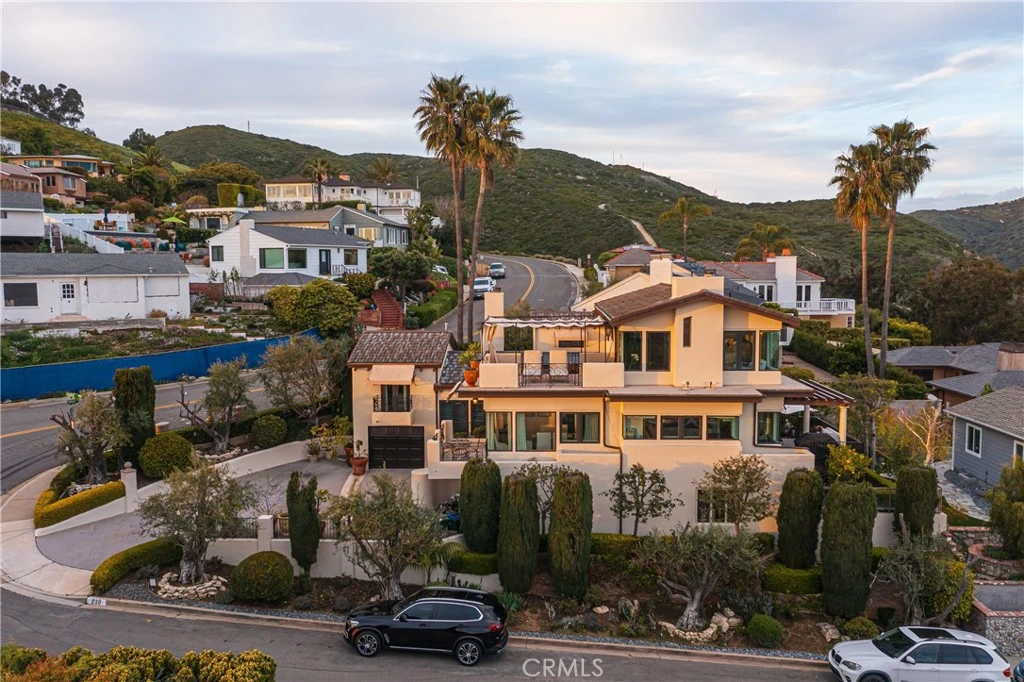 Located in the very desirable and sought-after Tree Streets in North Laguna Beach, this corner lot residence is embellished with approximately 103 feet of view frontage, offering picture-perfect white water/ocean, city, evening-light, Catalina Island, and sunset views from nearly every room. The elevated homesite is laid out over three levels and offers four bedrooms, four full baths, a library/office, and a large bonus room currently used as an exercise area. The main living level opens onto decks offering breathtaking vistas, as well as upgraded picture windows and an array of French doors, creating a seamless blend of indoor and outdoor living. Elegantly designed outdoor living spaces offer a perfect setting for gatherings, seamlessly extending onto large decks with stunning ocean views. The main level boasts a living room, kitchen, dining room, bedroom, and bath each designed with elegance and functionality in mind. Upstairs, the luxurious primary suite features a fireplace, private balcony, walk-in closet, and upgraded en suite bath with a soaking tub, separate walk-in shower with multiple shower heads, quartz counters, marble flooring, and vanity area. Fine craftsmanship is evident throughout, with rich beamed ceilings, elegant wood-plank flooring, and sophisticated recessed lighting. The library/office is located on a split level off of the main living area, as well as a very private bedroom and bath which offers a sweetheart balcony. The fourth bedroom and bath, as well as laundry, large gym, and garage, are on the lower level. Ample parking is provided by a lengthy driveway and one attached garage. The driveway will accommodate up to three vehicles. Ideally located minutes from the Dartmoor trailhead—a local favorite for hiking and biking enthusiasts—the home is also conveniently close to Crescent Bay, Main Beach, and Heisler Park, as well as within walking distance to Laguna's downtown shops and restaurants. This turn-key residence is a testament to luxury coastal living, promising an unmatched lifestyle in one of Laguna Beach's most coveted locations.