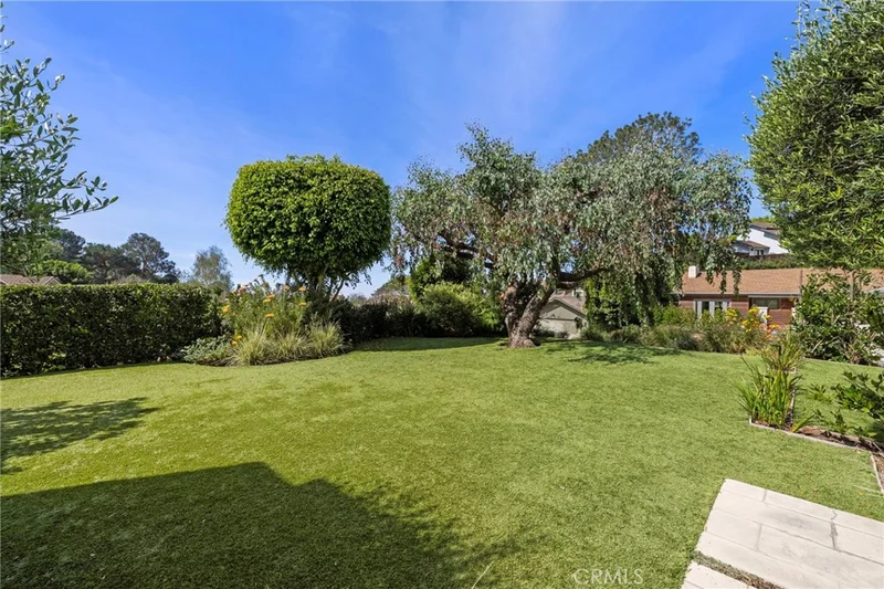 Modern design meets Laguna living at 3121 Bern Drive. Situated in desirable Top of the World neighborhood just up Park Avenue from downtown Laguna Beach. A rare Laguna find of large flat lawn with mature trees and gardens combined with ocean and Catalina Island view. Versatile floor plan that allows for main floor living if preferred with all conveniences on the main floor and no steps to access the home. Stone pathway with green plantings leads to a custom front double door with glass panes under sleek redwood siding design. The high vaulted main room enjoys an ocean and Catalina view and a gas fireplace with painted brick surround. The front dining area has built-in bench seating with storage, modern chandelier and floating wall shelving. Every room has a view to the green spaces surrounding this home, affording privacy combined with nature. The gourmet kitchen features Quartz counters, subway tile backsplash, Kohler farmhouse sink with gooseneck fixture, custom cabinetry and top of the line appliances including Viking gas range & microwave, Bosch dishwasher, new LG French door refrigerator/freezer. Dedicated dining room with glass pendant chandelier, this room can dual as a den/office, has kitchen bar seating and wonderful breezes through French & sliding glass doors that connect to the outdoor areas. The lush back patio with yard has flowering plantings, built-in gas fire pit, seating. The main floor primary suite remodeled with porcelain tile shower, dual Carrara marble vanities, walk-in closet with solid maple custom crafted organizers. An additional bedroom, remodeled half bathroom and separate laundry room complete the first level. Upstairs are three bedrooms and a remodeled bath with shower over tub. The corner upstairs bedroom has been enhanced by the addition of French doors to an ocean view deck with brilliant redwood material, glass rail partitions, framing stunning sunsets and Catalina Island over the ocean. Fiber optic underground wiring at this property has been completed for highly enhanced connectivity. The oversized driveway fits up to three vehicles and the two car garage provides direct access into the house. Alta Laguna Park & open space trails are just blocks away, providing pickle ball and tennis courts, park, playground and fields. Bern benefits as one of the most central locations to all K-12th grades with award winning Top of the World Elementary, Thurston Middle and Laguna Beach High School accessed within minutes.